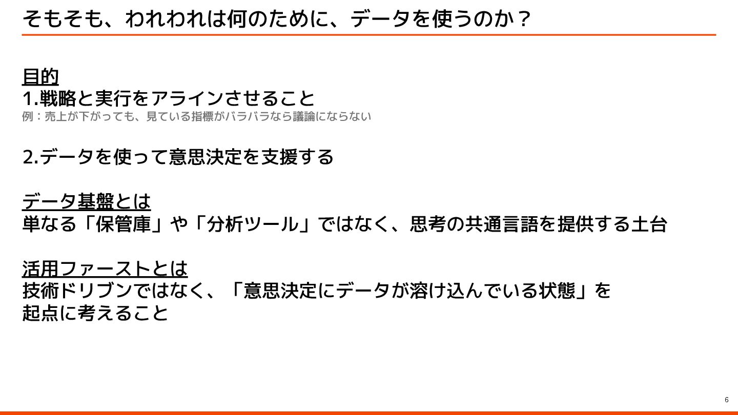そもそも、われわれは何のために、データを使うのか? 6 目的 1.戦略と実行をアラインさせること 例:売上が下がっても、見ている指標がバラバラなら議論にならない 2.データを使って意思決定を支援する データ基盤とは 単なる「保管庫」や「分析ツール」ではなく、思考の共通言語を提供する土台 活用ファーストとは 技術ドリブンではなく、「意思決定にデータが溶け込んでいる状態」を