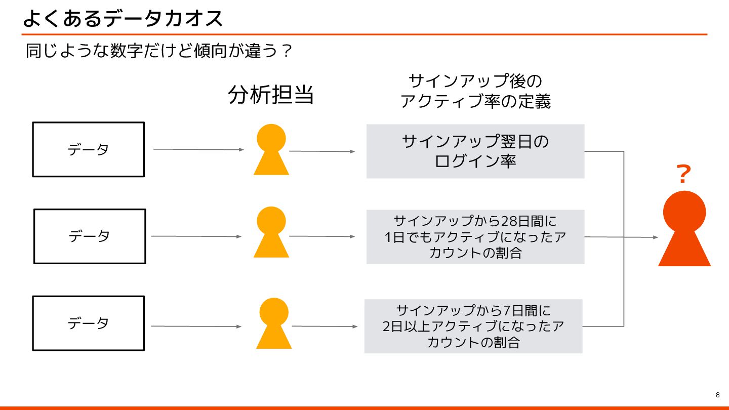 よくあるデータカオス 8 分析担当 サインアップ後の アクティブ率の定義 サインアップ翌日の ログイン率 サインアップから28日間に 1日でもアクティブになったア カウントの割合