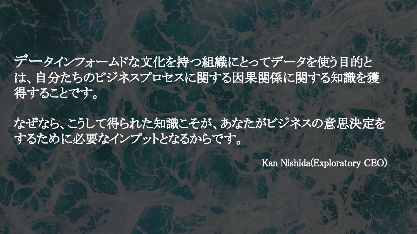 9 データインフォームドな文化を持つ組織にとってデータを使う目的と は、自分たちのビジネスプロセスに関する因果関係に関する知識を獲 得することです。 なぜなら、こうして得られた知識こそが、あなたがビジネスの意思決定を するために必要なインプットとなるからです。 Kan