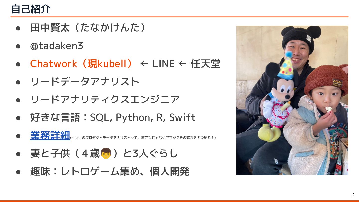 ← 任天堂 • リードデータアナリスト • リードアナリティクスエンジニア • 好きな言語:SQL, Python, R, Swift • 業務詳細 (kubellのプロダクトデータアナリストって、激アツじゃないですか?その魅力を3つ紹介!) • 妻と子供(4歳👦)と3人ぐらし • 趣味:レトロゲーム集め、個人開発