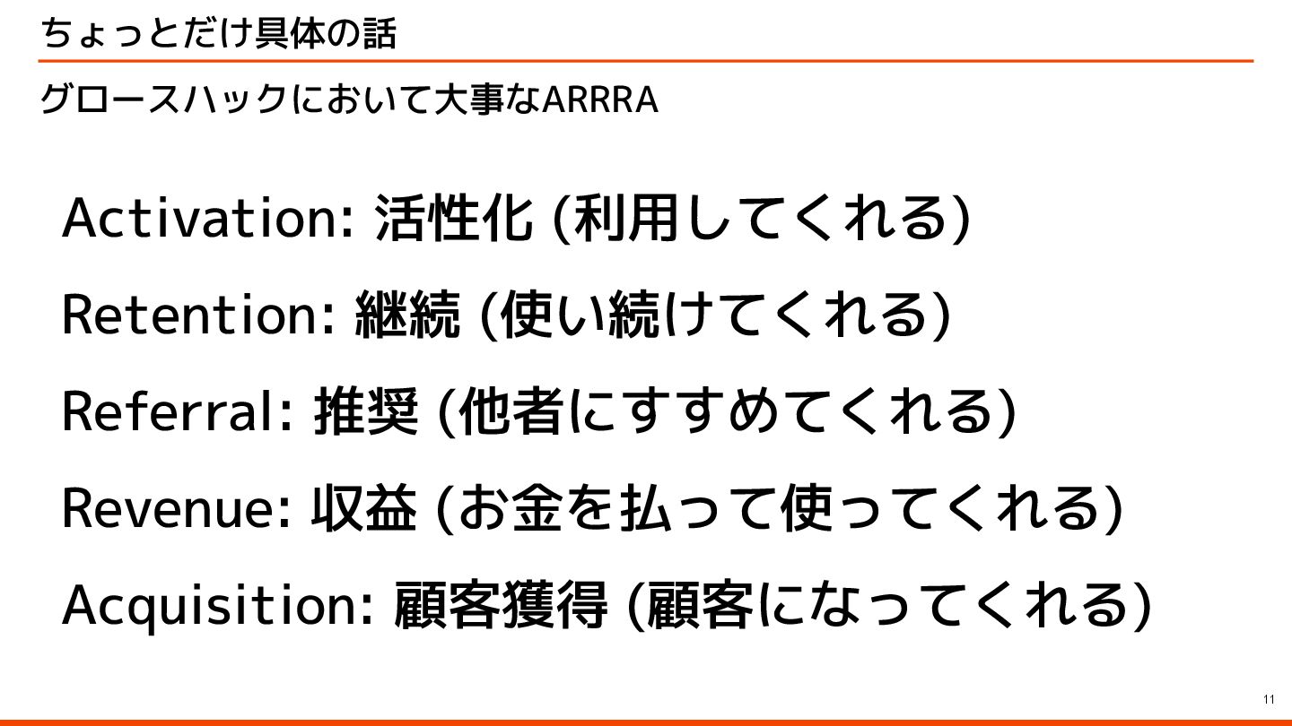 ちょっとだけ具体の話 11 グロースハックにおいて大事なARRRA Activation: 活性化 (利用してくれる) Retention: 継続 (使い続けてくれる) Referral: