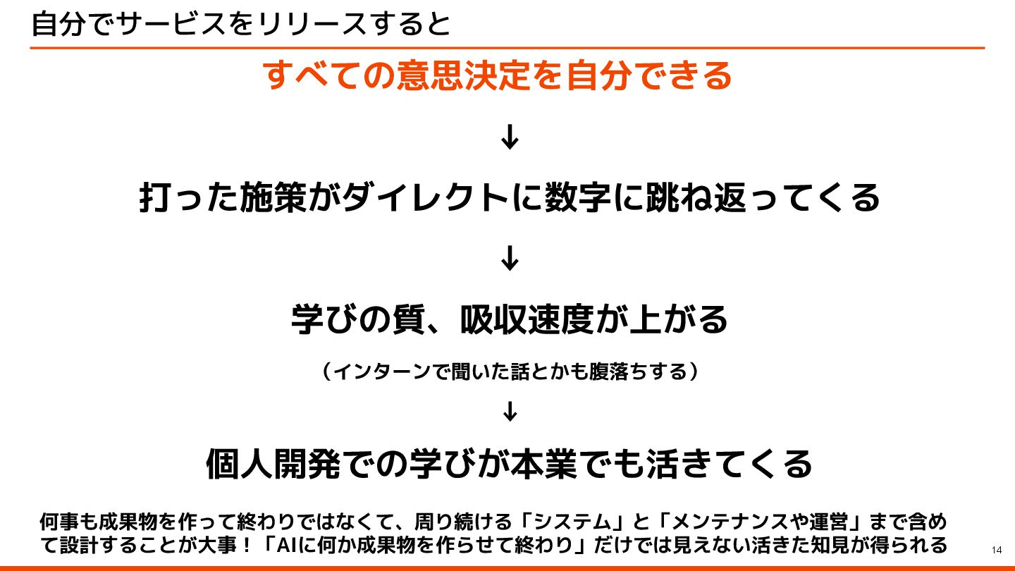 自分でサービスをリリースすると 14 すべての意思決定を自分できる ↓ 打った施策がダイレクトに数字に跳ね返ってくる ↓ 学びの質、吸収速度が上がる (インターンで聞いた話とかも腹落ちする) ↓ 個人開発での学びが本業でも活きてくる