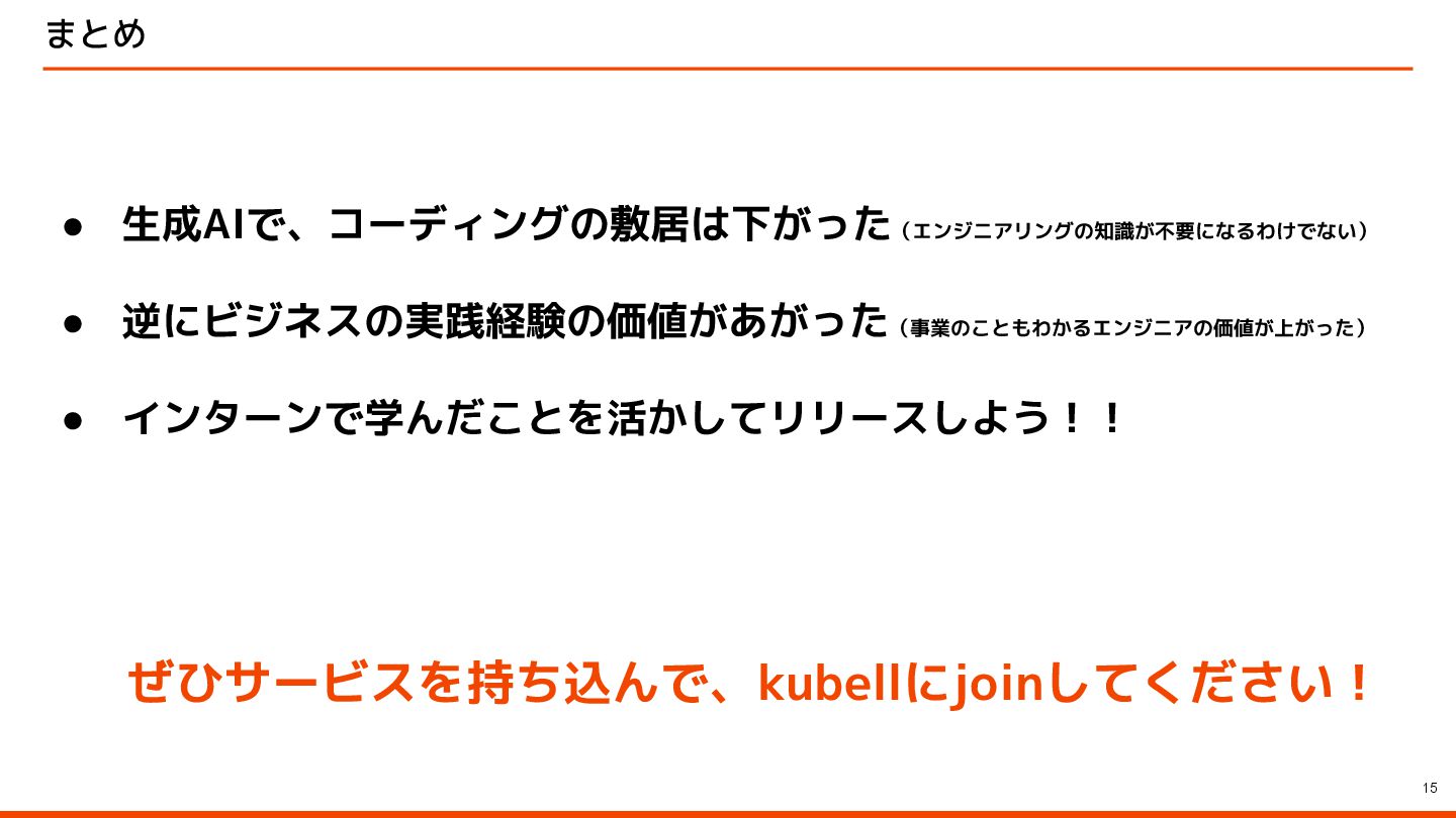 まとめ 15 • 生成AIで、コーディングの敷居は下がった(エンジニアリングの知識が不要になるわけでない) • 逆にビジネスの実践経験の価値があがった(事業のこともわかるエンジニアの価値が上がった) • インターンで学んだことを活かしてリリースしよう!! ぜひサービスを持ち込んで、kubellにjoinしてください!