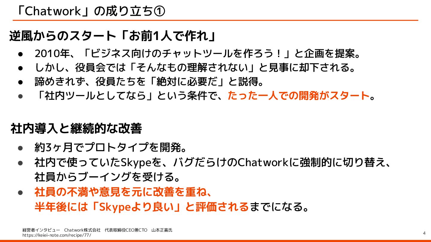 「Chatwork」の成り立ち① 4 逆風からのスタート「お前1人で作れ」 社内導入と継続的な改善 経営者インタビュー Chatwork株式会社 代表取締役CEO兼CTO 山本正喜氏 https://keiei-note.com/recipe/77/ • 2010年、「ビジネス向けのチャットツールを作ろう!」と企画を提案。 • しかし、役員会では「そんなもの理解されない」と見事に却下される。