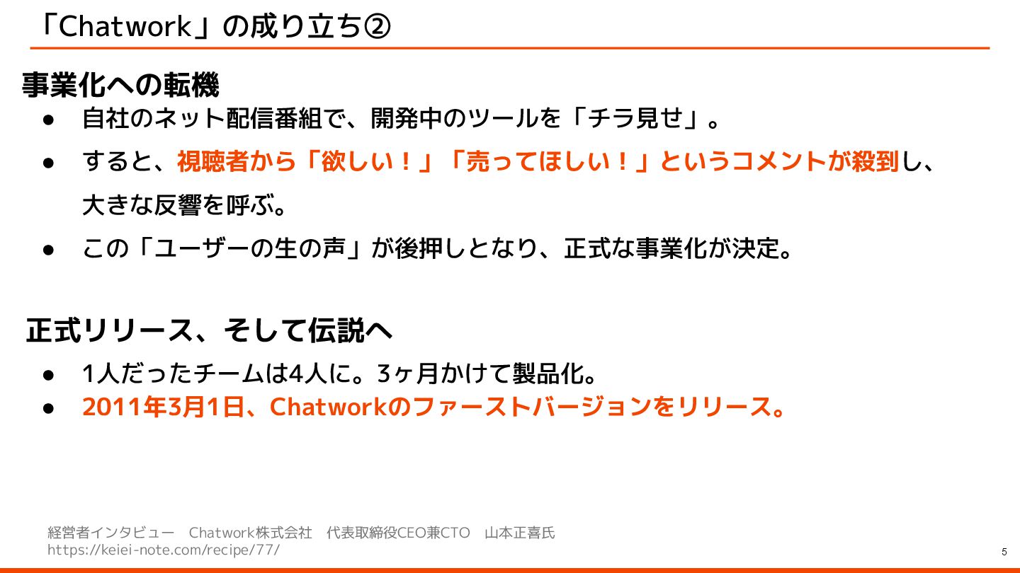 「Chatwork」の成り立ち② 5 事業化への転機 正式リリース、そして伝説へ 経営者インタビュー Chatwork株式会社 代表取締役CEO兼CTO 山本正喜氏 https://keiei-note.com/recipe/77/ • 自社のネット配信番組で、開発中のツールを「チラ見せ」。 • すると、視聴者から「欲しい!」「売ってほしい!」というコメントが殺到し、
