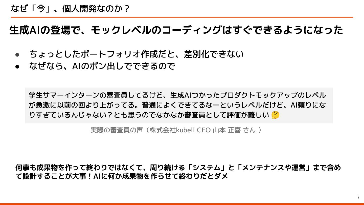 正喜 さん ) 何事も成果物を作って終わりではなくて、周り続ける「システム」と「メンテナンスや運営」まで含め て設計することが大事!AIに何か成果物を作らせて終わりだとダメ 学生サマーインターンの審査員してるけど、生成AIつかったプロダクトモックアップのレベル が急激に以前の回より上がってる。普通によくできてるなーというレベルだけど、AI頼りにな りすぎているんじゃない?とも思うのでなかなか審査員として評価が難しい 🤔