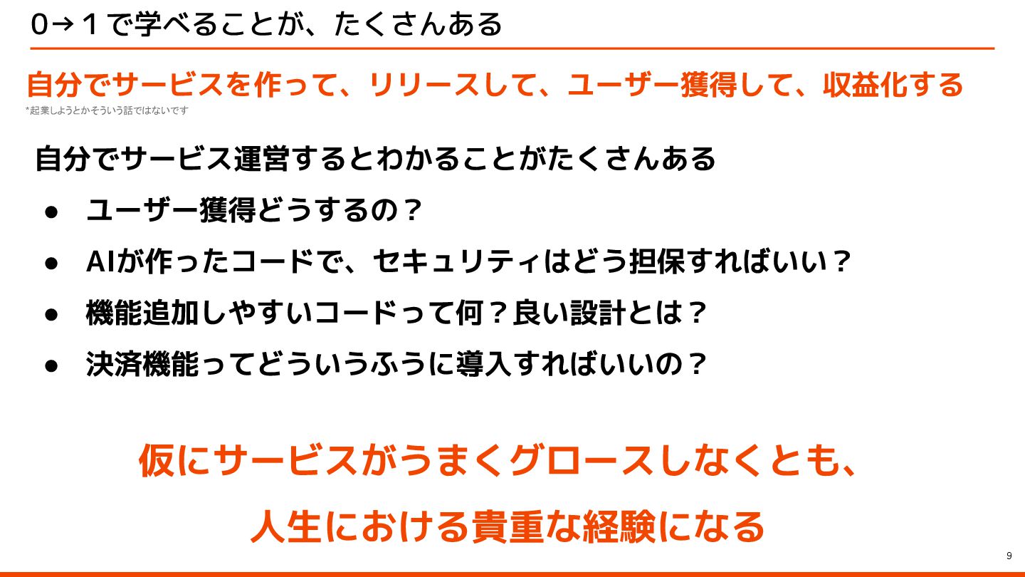 0→1で学べることが、たくさんある 9 自分でサービスを作って、リリースして、ユーザー獲得して、収益化する 自分でサービス運営するとわかることがたくさんある • ユーザー獲得どうするの? • AIが作ったコードで、セキュリティはどう担保すればいい? • 機能追加しやすいコードって何?良い設計とは?