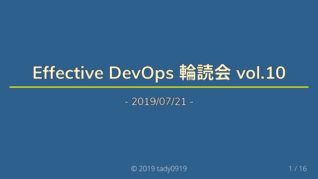 輪読会 vol.10 Effective DevOps 輪読会 vol.10 Effective DevOps 輪読会 vol.10 Effective DevOps 輪読会 vol.10 - 2019/07/21 - - 2019/07/21 - - 2019/07/21 - - 2019/07/21 - - 2019/07/21 - - 2019/07/21 - © 2019 tady0919 1 / 16