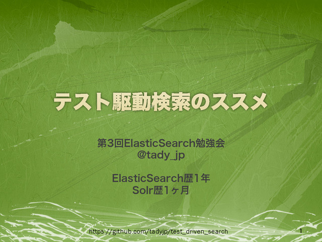 ୈճ&MBTUJD4FBSDIษڧձ !UBEZ@KQ &MBTUJD4FBSDIྺ 4PMSྺϲ݄ https://github.com/tadyjp/test_driven_search