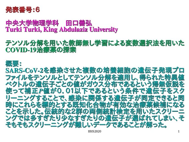 L 1 ∑ l 2 =1 L 2 ∑ l 3 =1 L 3 ∑ l 4 =1 L 4 G(l 1 l 2 l 3 l 4 )u l 1 j u l 2 k u l 3 m u l 4 i u l1j : l 1 種類の肺がんの培養目の培養細胞依存の肺がんの培養細培養細胞に依存性 u l2k : l 2 種類の肺がんの培養目の培養細胞依存の肺がんの培養細SARS-CoV-2感染させた。有無依存性 u l3m : l 3 種類の肺がんの培養目の培養細胞依存の肺がんの培養細biological replicate 依存性 u l4i : l 4 種類の肺がんの培養目の培養細胞依存の肺がんの培養細遺伝子依存性 G: 各項の重みの肺がんの培養細重みみ 目的とする既知化合:培養細胞の遺伝子発現プの探索種類ややbiological replicateに 依らない(らな治療薬候補にない(u l1j やu l3m は多すぎたり少なj,mに依らない(らず一定値)一定できると同値) がガウス分布であ、得られた特異値SARS-CoV-2感染させた複数の培の探索有無し学習による変で変わる変数選択法を用 (u l21 =-u l22 )にな治療薬候補になる変数選択法を用よう帰無仮説をな治療薬候補になl 1 ,l 2 ,l 3 を感染させた。選びたいびたい