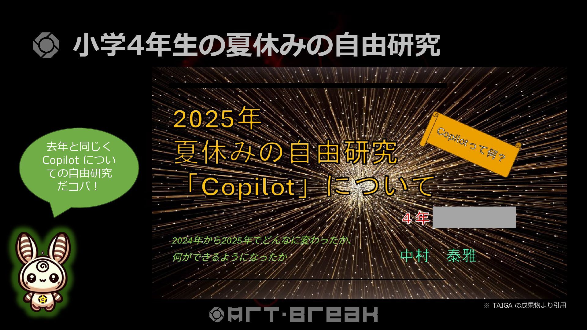 小学4年生の夏休みの自由研究 去年と同じく Copilot につい ての自由研究 だコパ! ※ TAIGA の成果物より引用