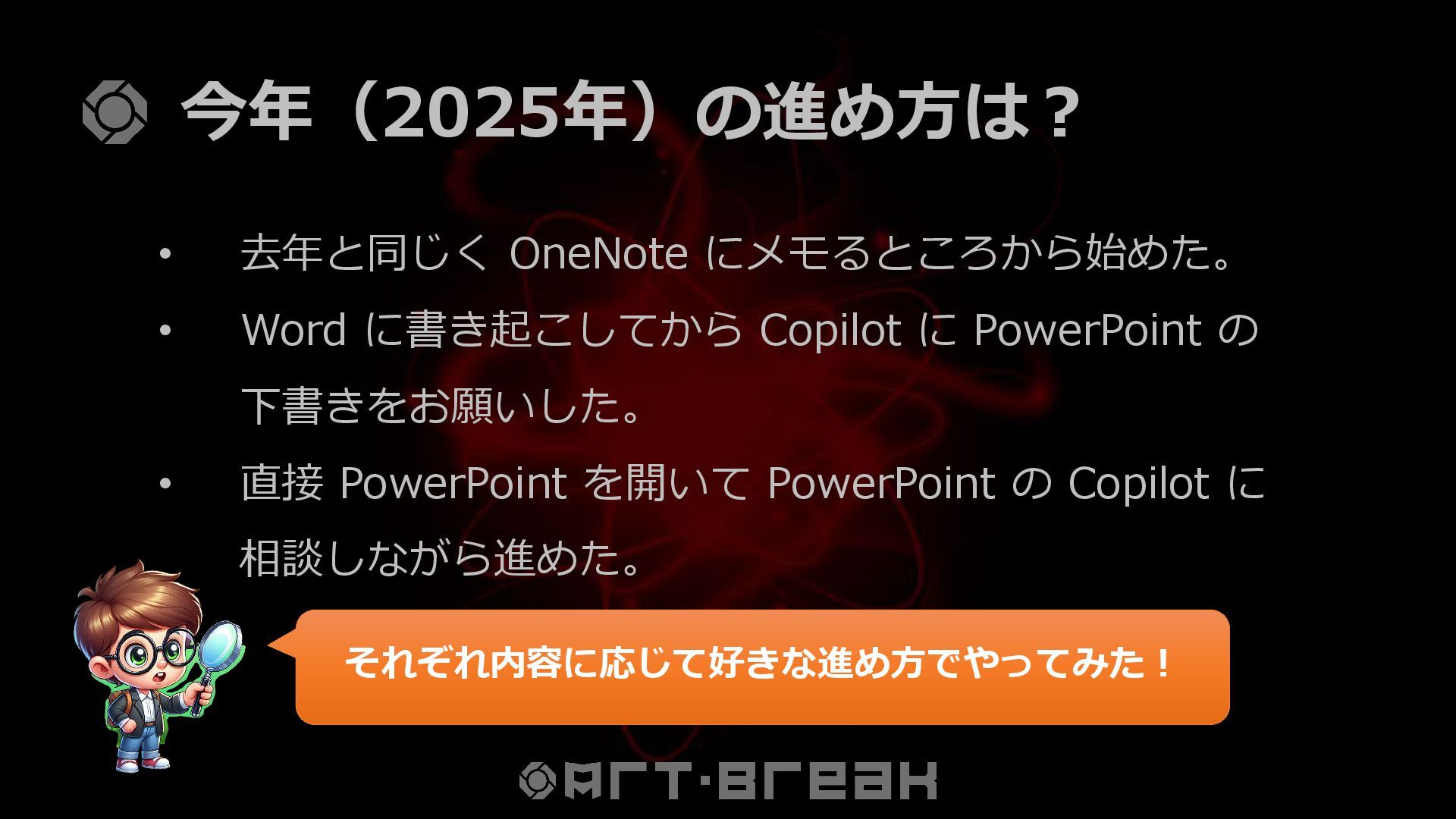 今年(2025年)の進め方は? • 去年と同じく OneNote にメモるところから始めた。 • Word に書き起こしてから Copilot に
