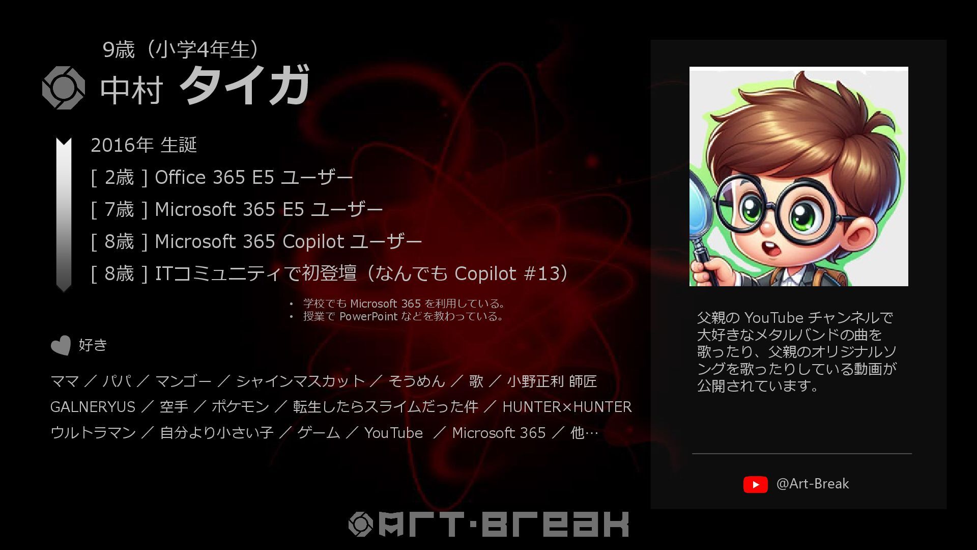 7歳 ] Microsoft 365 E5 ユーザー [ 8歳 ] Microsoft 365 Copilot ユーザー [ 8歳 ] ITコミュニティで初登壇(なんでも Copilot #13) 好き ママ / パパ / マンゴー / シャインマスカット / そうめん / 歌 / 小野正利 師匠 GALNERYUS / 空手 / ポケモン / 転生したらスライムだった件 / HUNTER×HUNTER ウルトラマン / 自分より小さい子 / ゲーム / YouTube / Microsoft 365 / 他… 中村 タイガ 9歳(小学4年生) @Art-Break 父親の YouTube チャンネルで 大好きなメタルバンドの曲を 歌ったり、父親のオリジナルソ ングを歌ったりしている動画が 公開されています。 • 学校でも Microsoft 365 を利用している。 • 授業で PowerPoint などを教わっている。