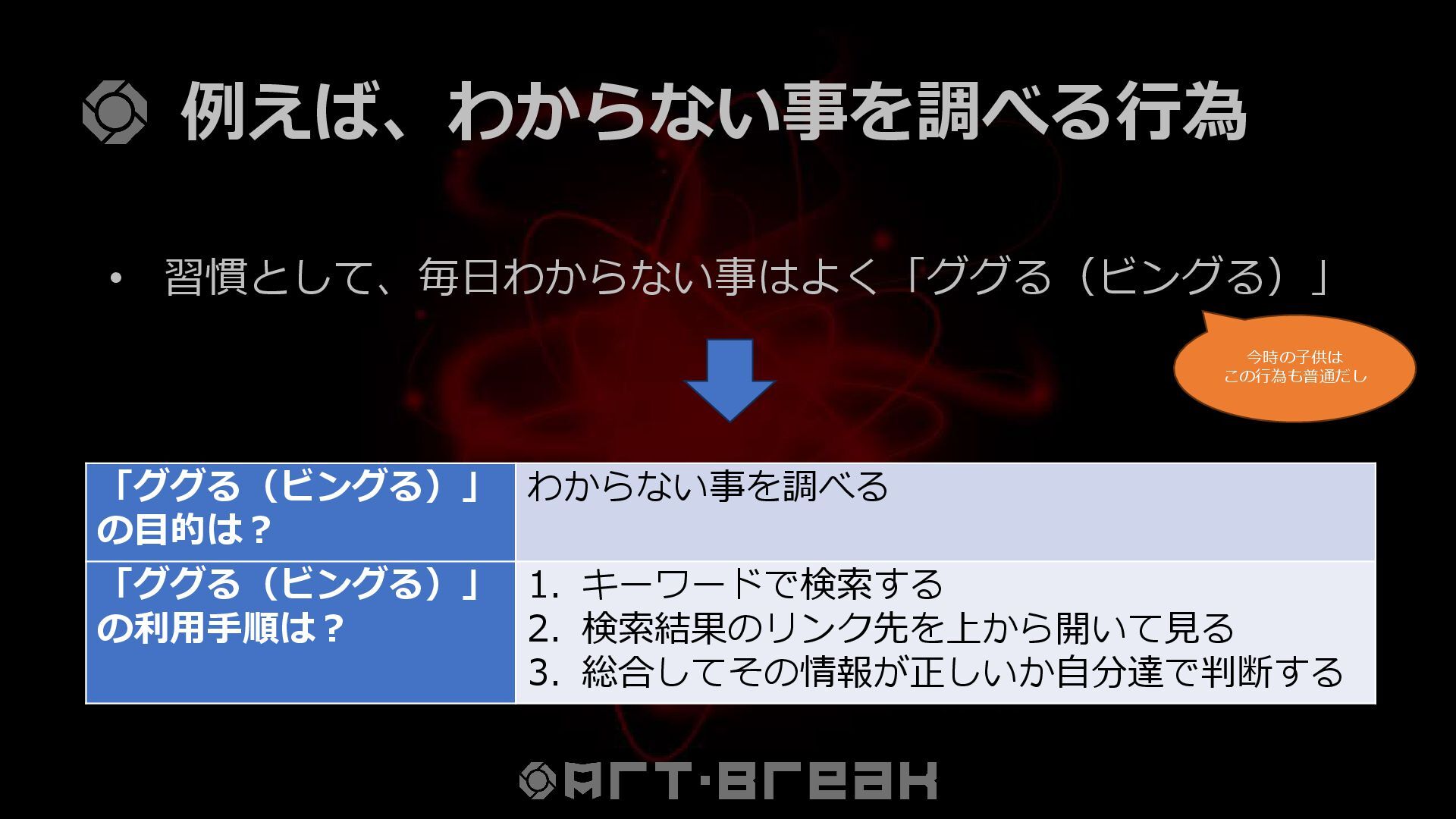 例えば、わからない事を調べる行為 「ググる(ビングる)」 の目的は? わからない事を調べる 「ググる(ビングる)」 の利用手順は? 1. キーワードで検索する 2. 検索結果のリンク先を上から開いて見る