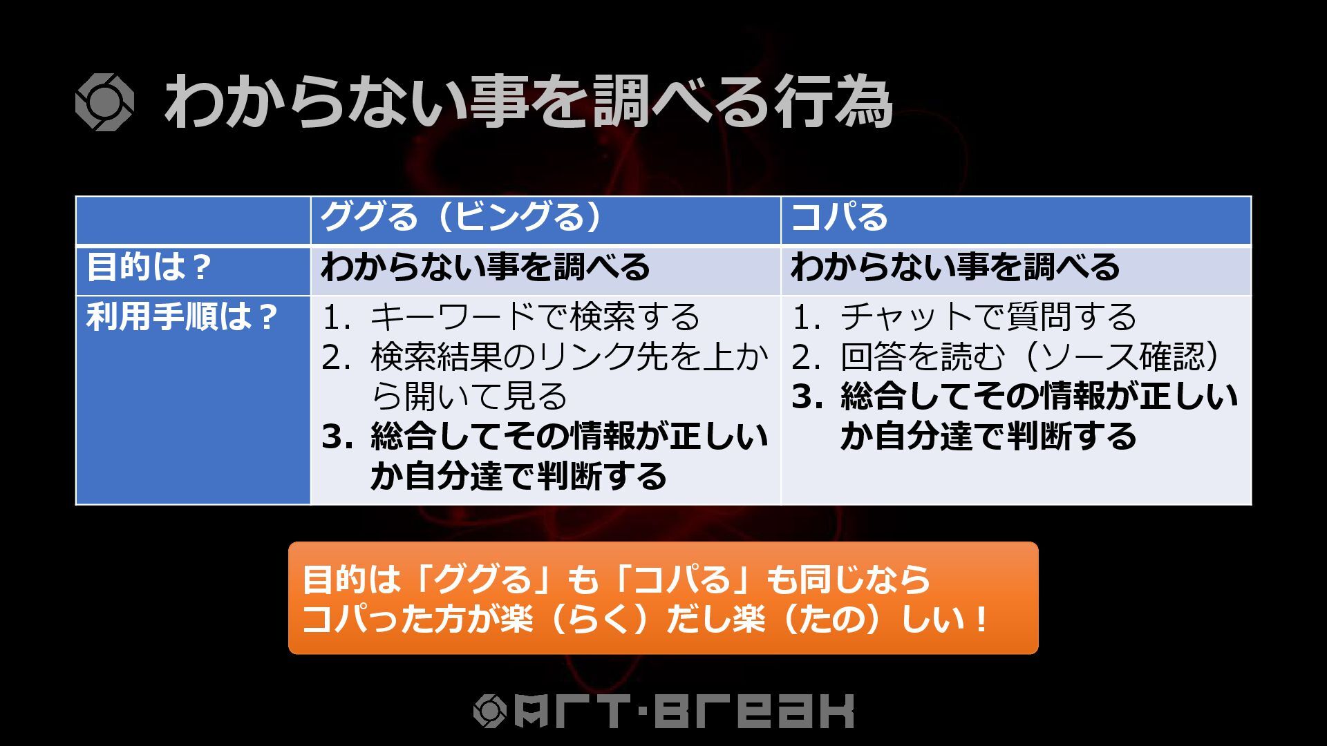 キーワードで検索する 2. 検索結果のリンク先を上か ら開いて見る 3. 総合してその情報が正しい か自分達で判断する 1. チャットで質問する 2. 回答を読む(ソース確認) 3. 総合してその情報が正しい か自分達で判断する