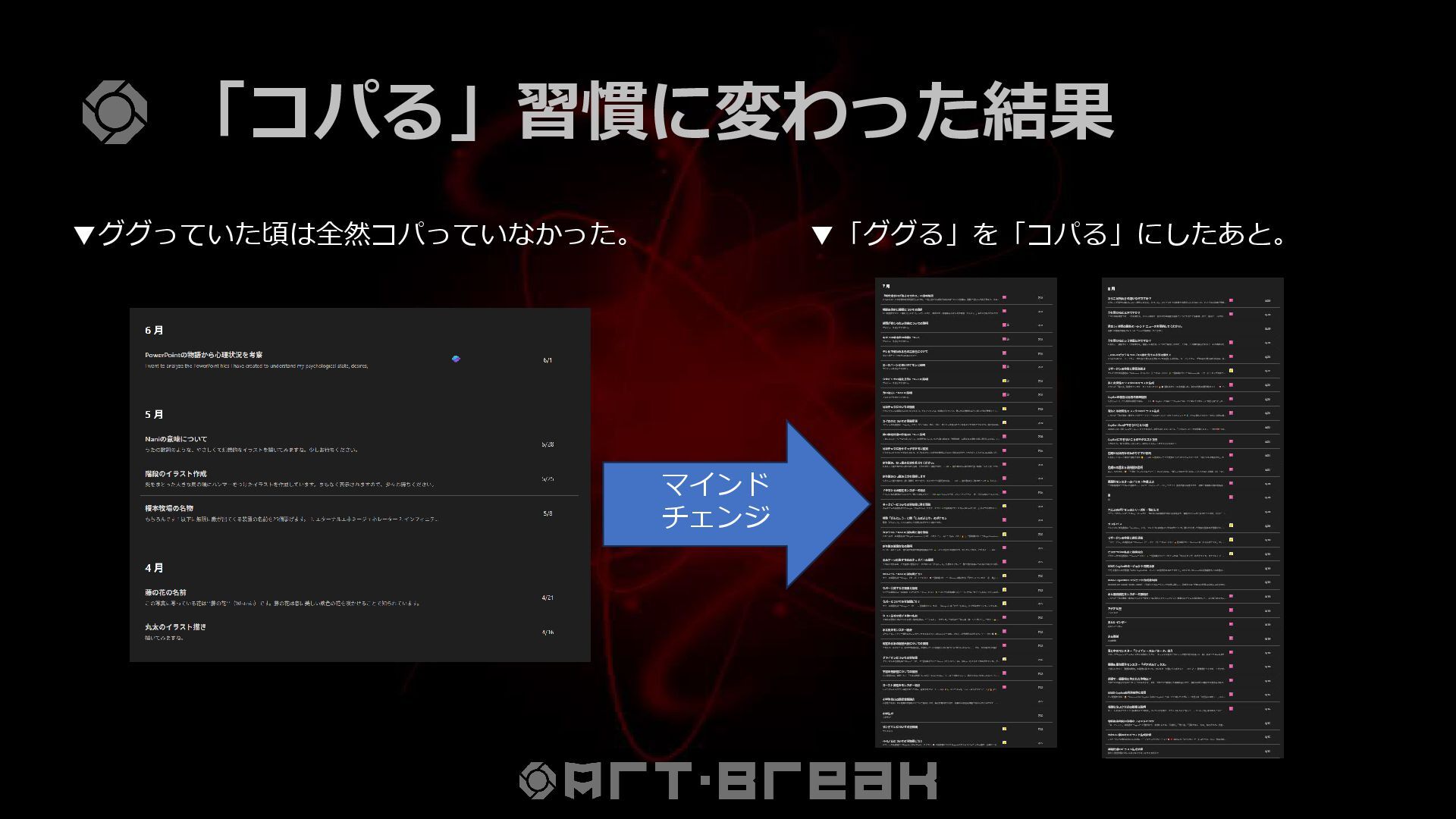 「コパる」習慣に変わった結果 ▼ググっていた頃は全然コパっていなかった。 ▼「ググる」を「コパる」にしたあと。 マインド チェンジ