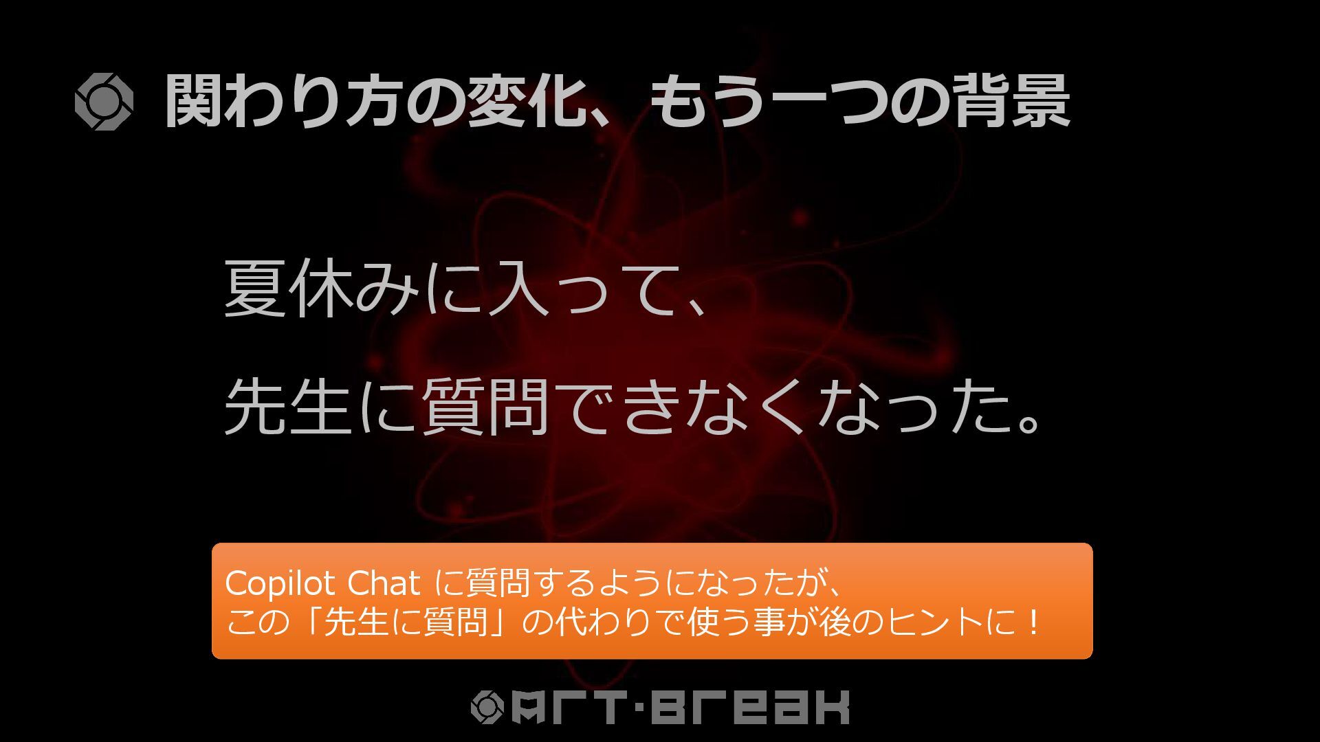 関わり方の変化、もう一つの背景 夏休みに入って、 先生に質問できなくなった。 Copilot Chat に質問するようになったが、 この「先生に質問」の代わりで使う事が後のヒントに!