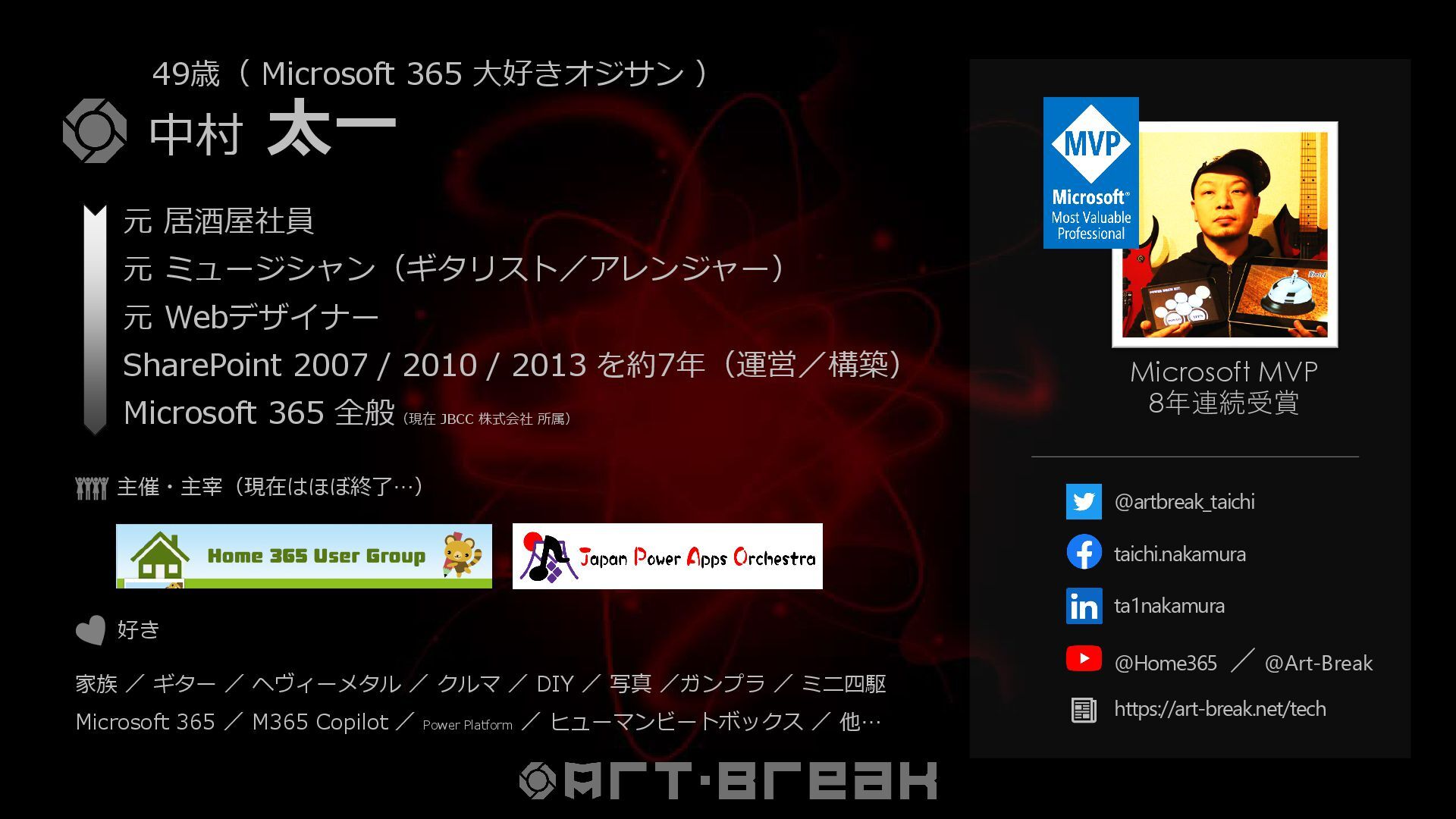 / 2013 を約7年(運営/構築) Microsoft 365 全般(現在 JBCC 株式会社 所属) 好き 家族 / ギター / ヘヴィーメタル / クルマ / DIY / 写真 /ガンプラ / ミニ四駆 Microsoft 365 / M365 Copilot / Power Platform / ヒューマンビートボックス / 他… 中村 太一 Microsoft MVP 8年連続受賞 49歳( Microsoft 365 大好きオジサン ) ta1nakamura @artbreak_taichi taichi.nakamura @Home365 / @Art-Break https://art-break.net/tech 主催・主宰(現在はほぼ終了…)