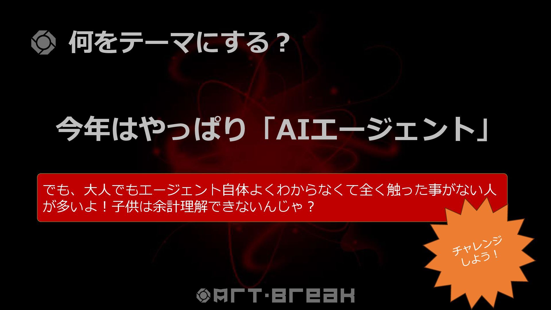 何をテーマにする? 今年はやっぱり「AIエージェント」 でも、大人でもエージェント自体よくわからなくて全く触った事がない人 が多いよ!子供は余計理解できないんじゃ?