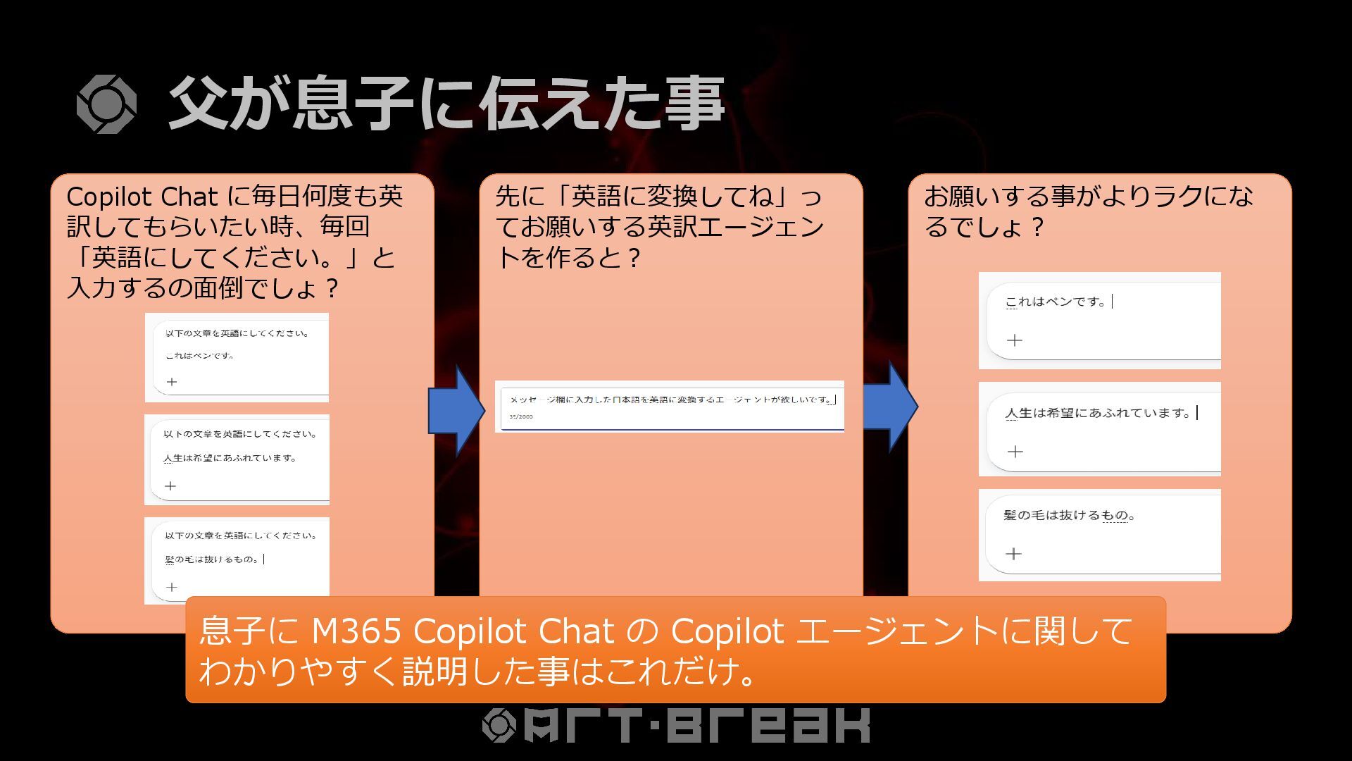 てお願いする英訳エージェン トを作ると? 息子に M365 Copilot Chat の Copilot エージェントに関して わかりやすく説明した事はこれだけ。
