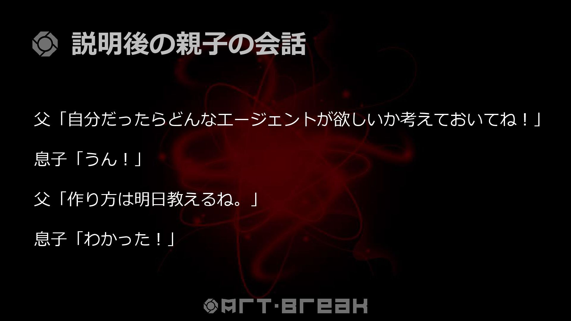 説明後の親子の会話 父「自分だったらどんなエージェントが欲しいか考えておいてね!」 息子「うん!」 父「作り方は明日教えるね。」 息子「わかった!」