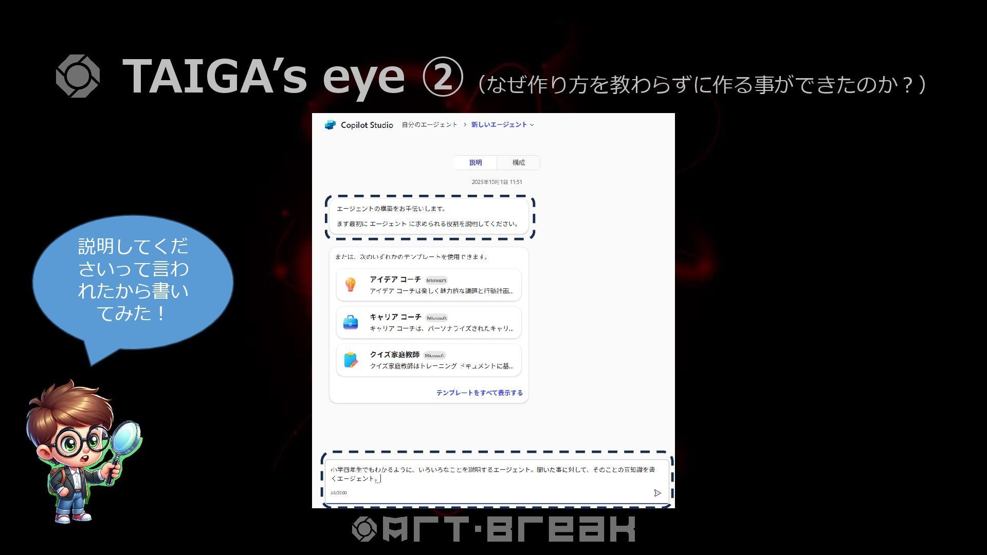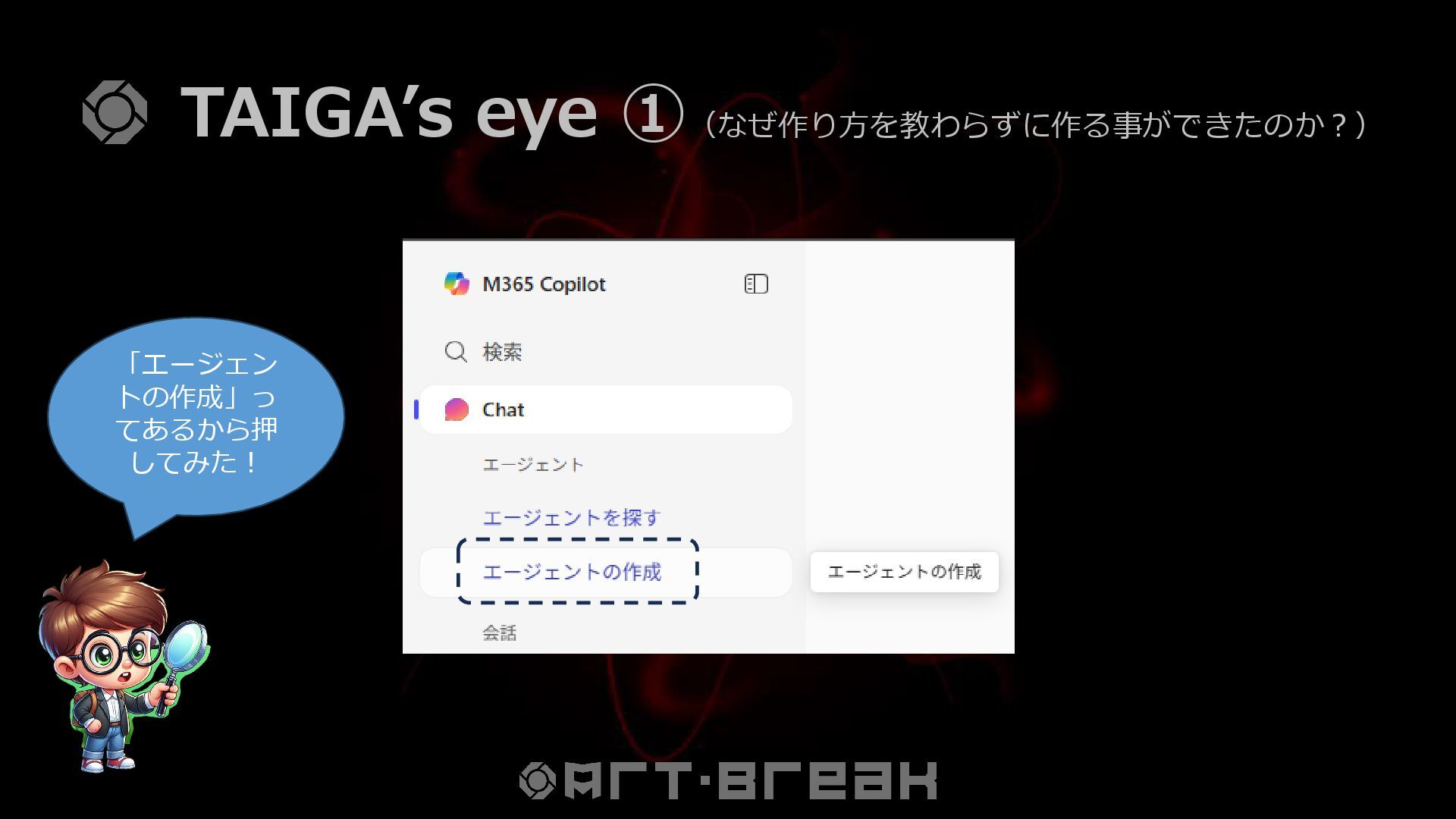 TAIGA’s eye ①(なぜ作り方を教わらずに作る事ができたのか?) 「エージェン トの作成」っ てあるから押 してみた!