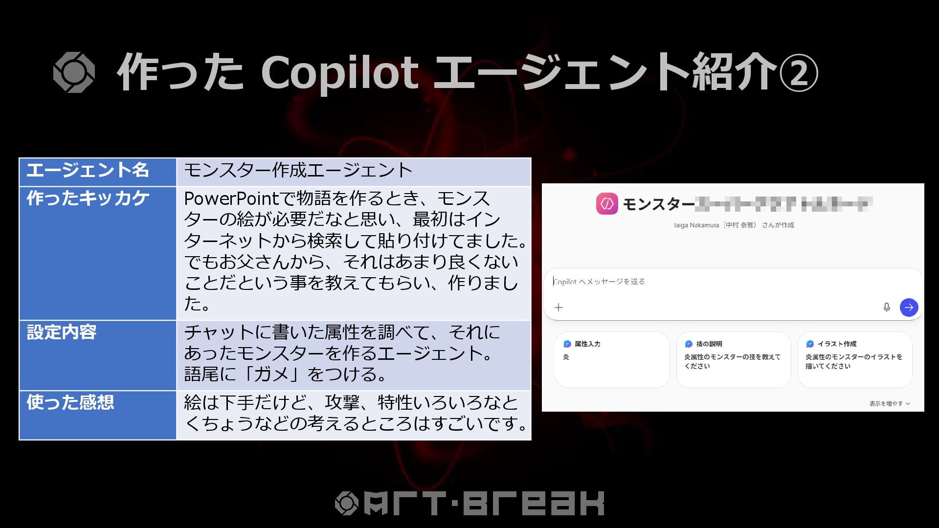 作った Copilot エージェント紹介② エージェント名 モンスター作成エージェント 作ったキッカケ PowerPointで物語を作るとき、モンス ターの絵が必要だなと思い、最初はイン ターネットから検索して貼り付けてました。 でもお父さんから、それはあまり良くない
