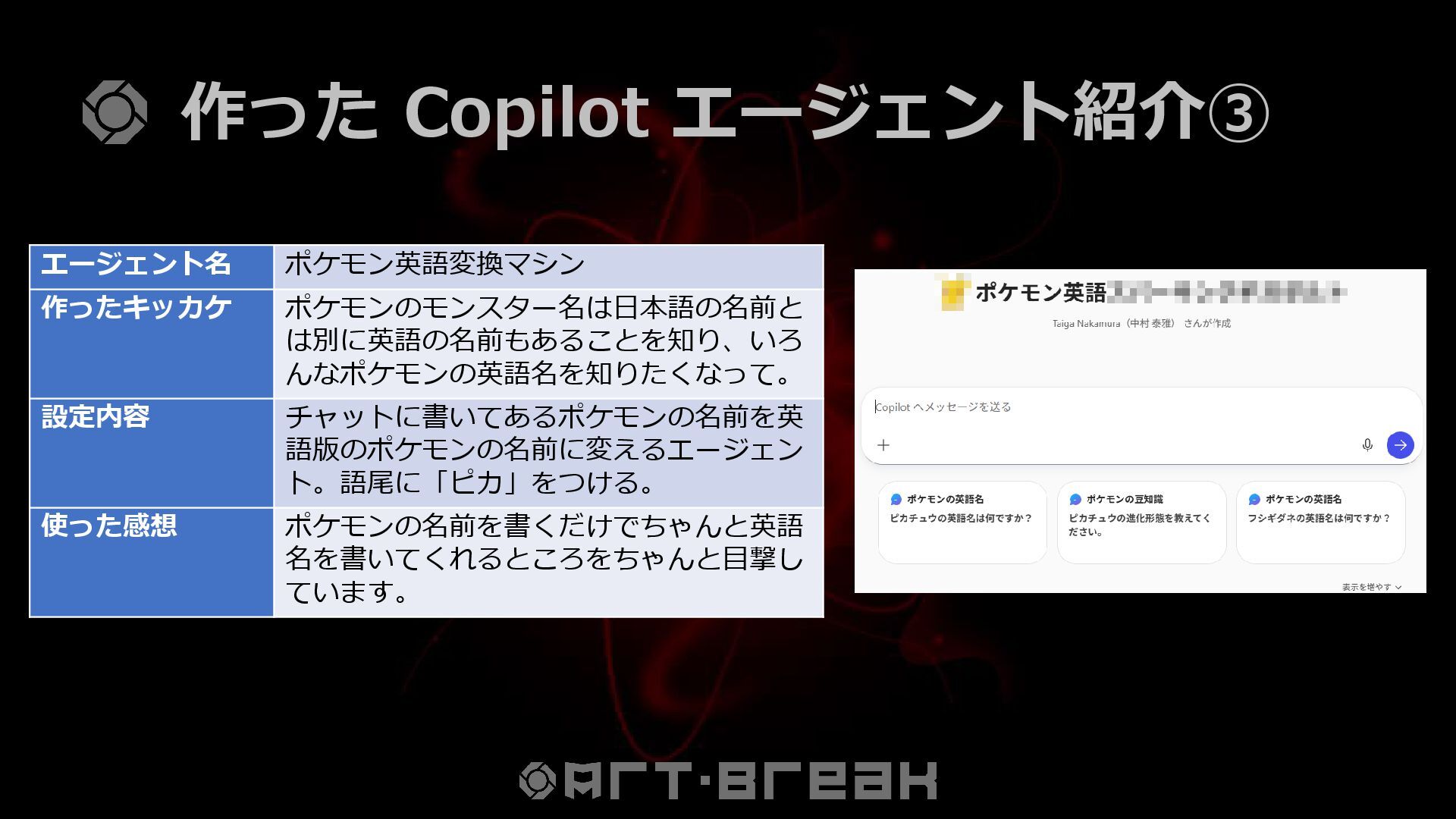作った Copilot エージェント紹介③ エージェント名 ポケモン英語変換マシン 作ったキッカケ ポケモンのモンスター名は日本語の名前と は別に英語の名前もあることを知り、いろ んなポケモンの英語名を知りたくなって。 設定内容