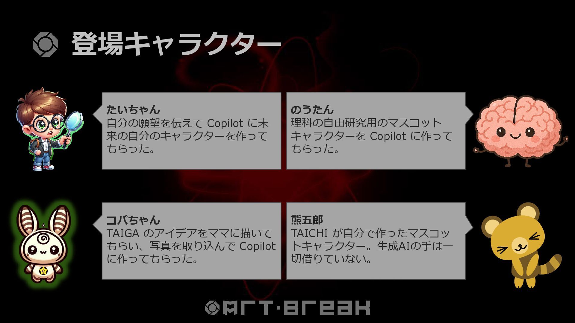 登場キャラクター たいちゃん 自分の願望を伝えて Copilot に未 来の自分のキャラクターを作って もらった。 コパちゃん TAIGA のアイデアをママに描いて