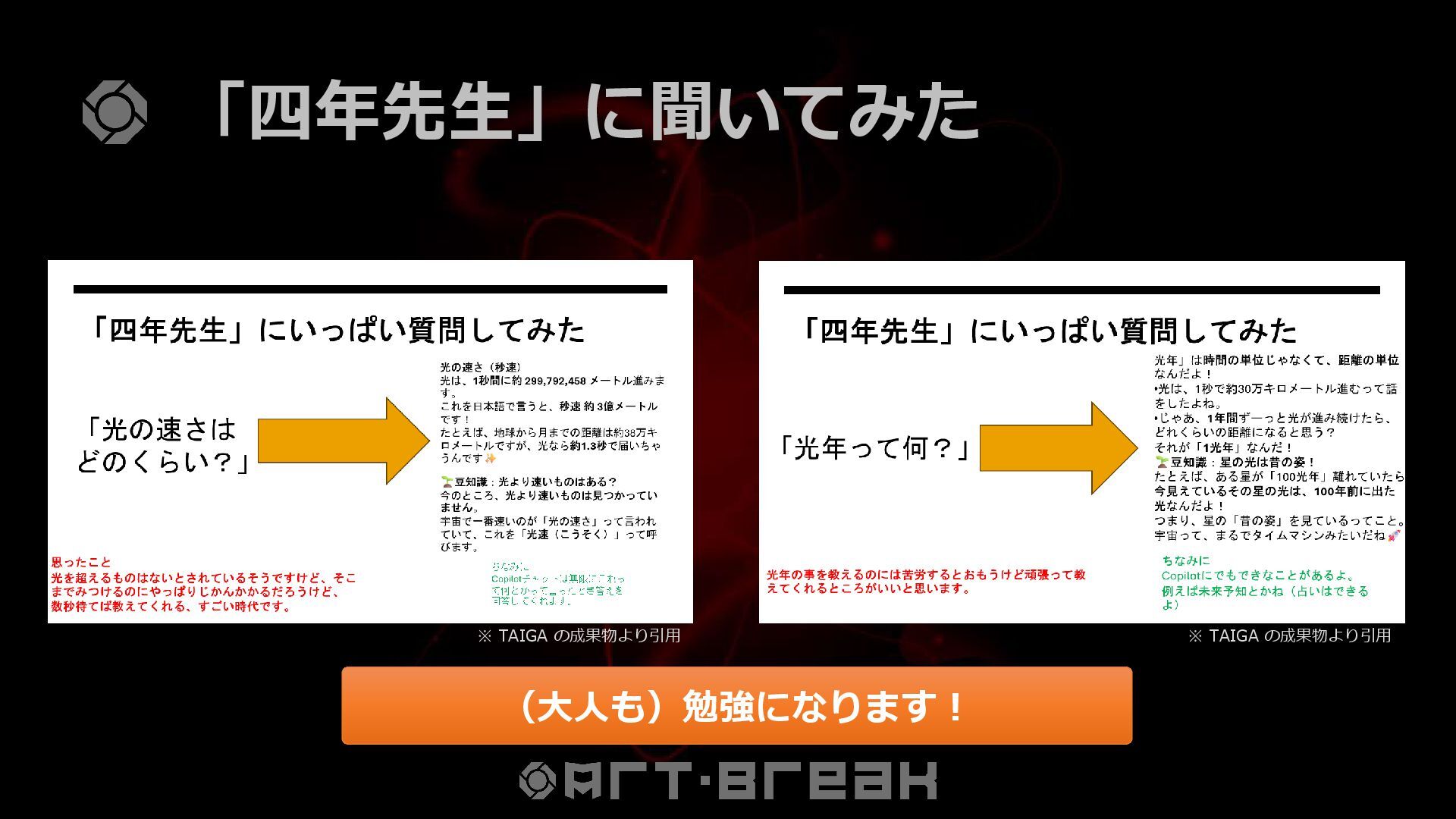 「四年先生」に聞いてみた (大人も)勉強になります! ※ TAIGA の成果物より引用 ※ TAIGA の成果物より引用