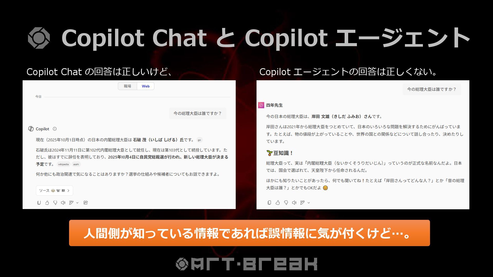 Copilot Chat と Copilot エージェント Copilot Chat の回答は正しいけど、 Copilot エージェントの回答は正しくない。