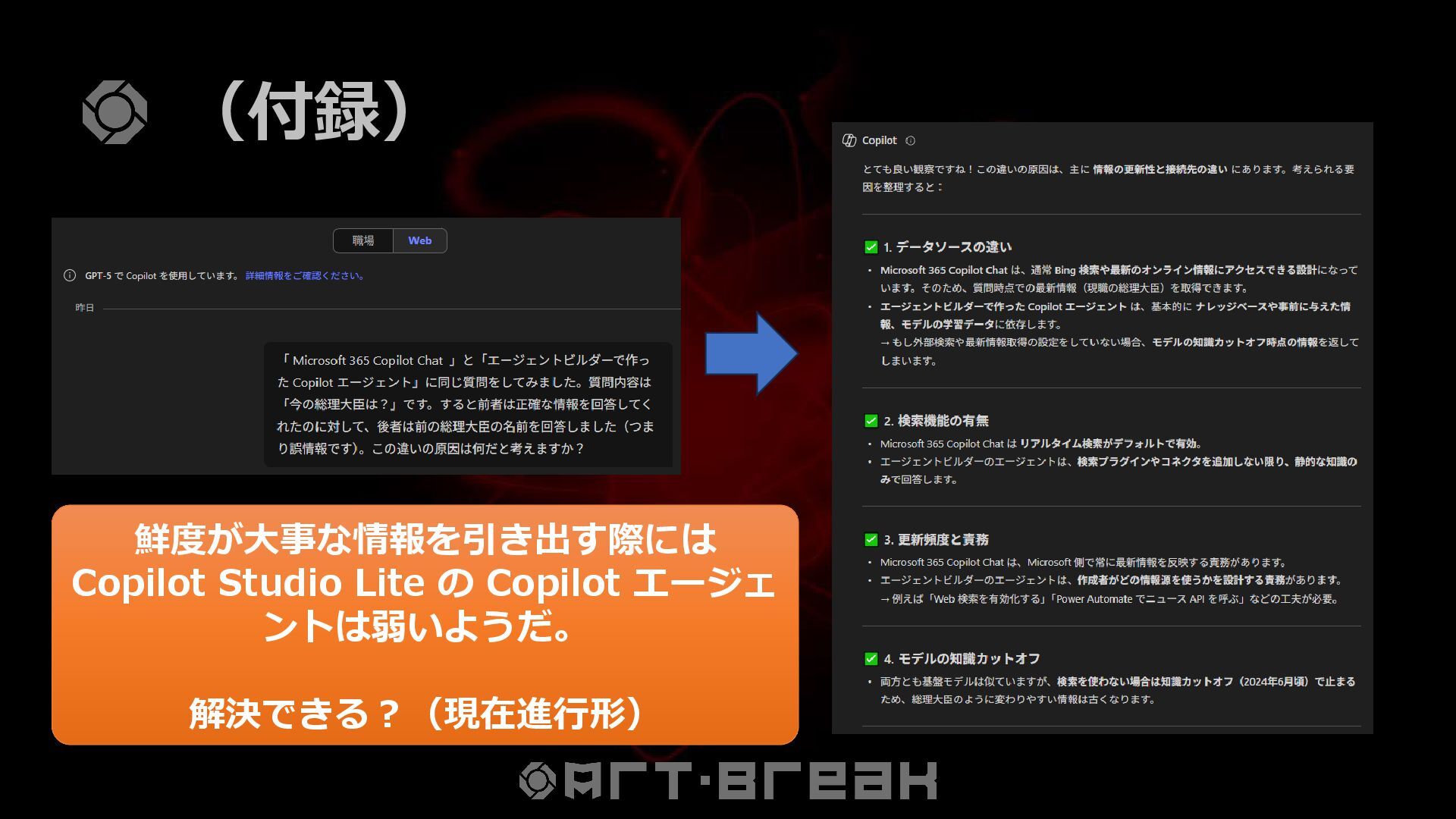 (付録) 鮮度が大事な情報を引き出す際には Copilot Studio Lite の Copilot エージェ ントは弱いようだ。 解決できる?(現在進行形)
