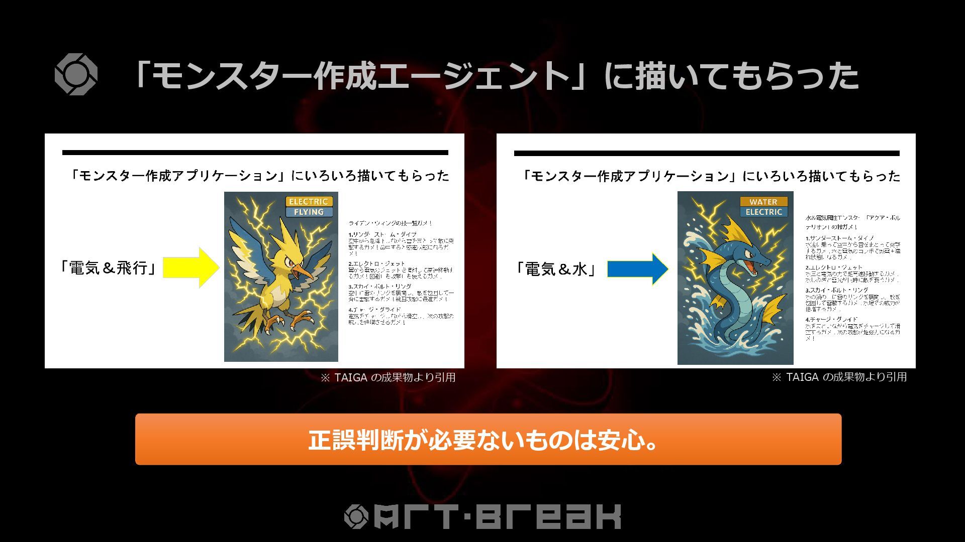 「モンスター作成エージェント」に描いてもらった 正誤判断が必要ないものは安心。 ※ TAIGA の成果物より引用 ※ TAIGA の成果物より引用