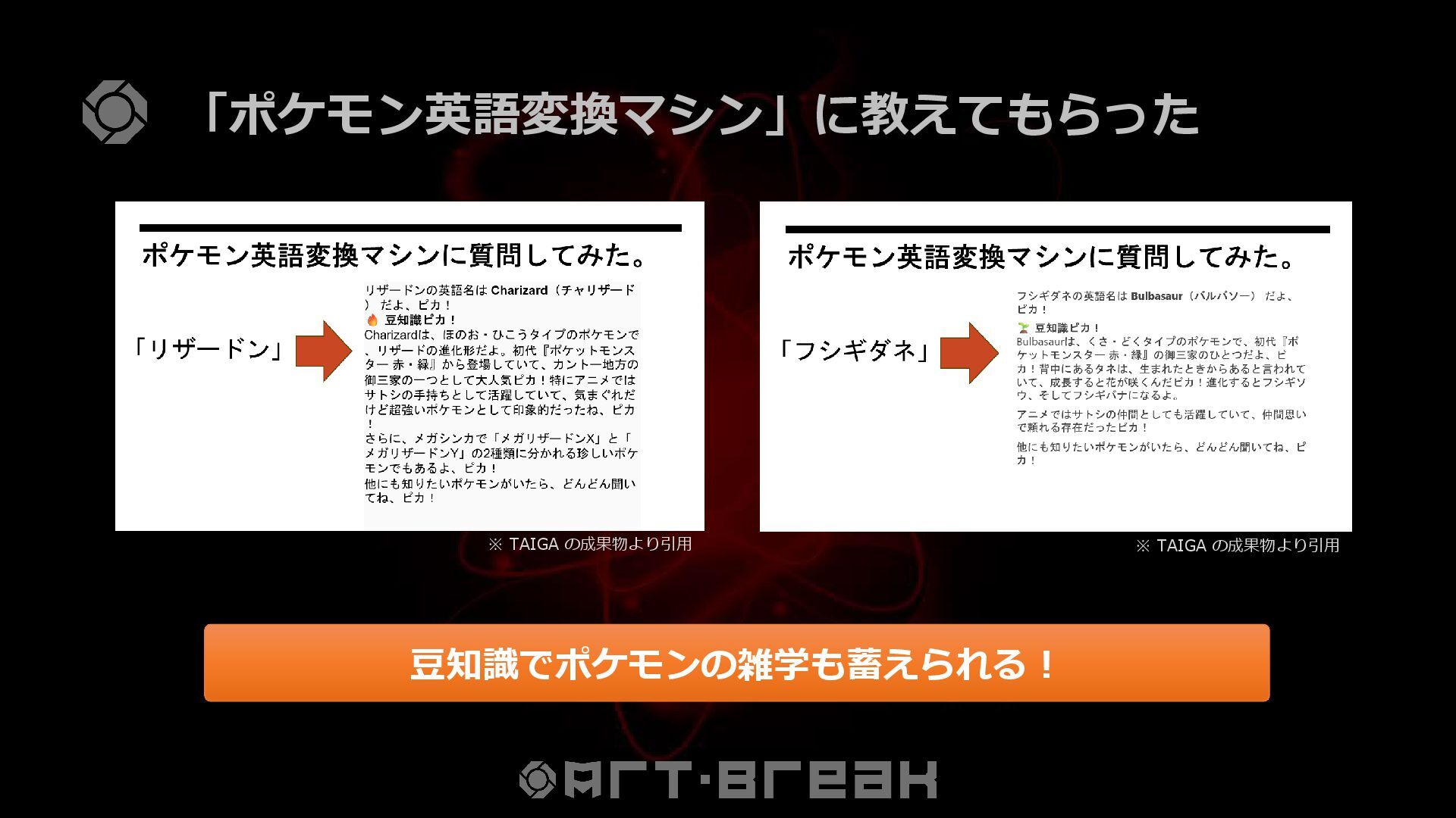 「ポケモン英語変換マシン」に教えてもらった 豆知識でポケモンの雑学も蓄えられる! ※ TAIGA の成果物より引用 ※ TAIGA の成果物より引用