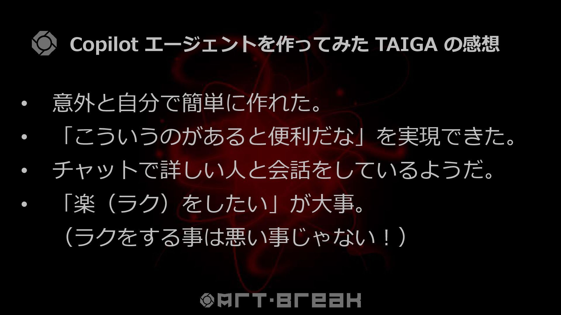 Copilot エージェントを作ってみた TAIGA の感想 • 意外と自分で簡単に作れた。 • 「こういうのがあると便利だな」を実現できた。 • チャットで詳しい人と会話をしているようだ。