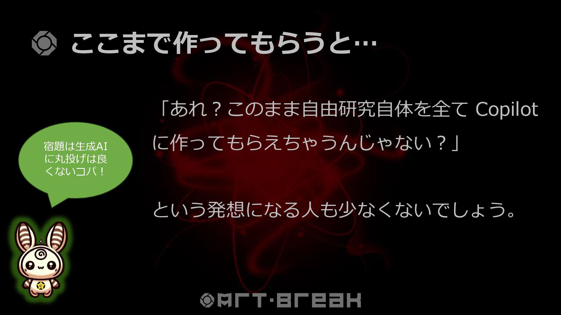 「あれ?このまま自由研究自体を全て Copilot に作ってもらえちゃうんじゃない?」 という発想になる人も少なくないでしょう。 ここまで作ってもらうと… 宿題は生成AI に丸投げは良 くないコパ!