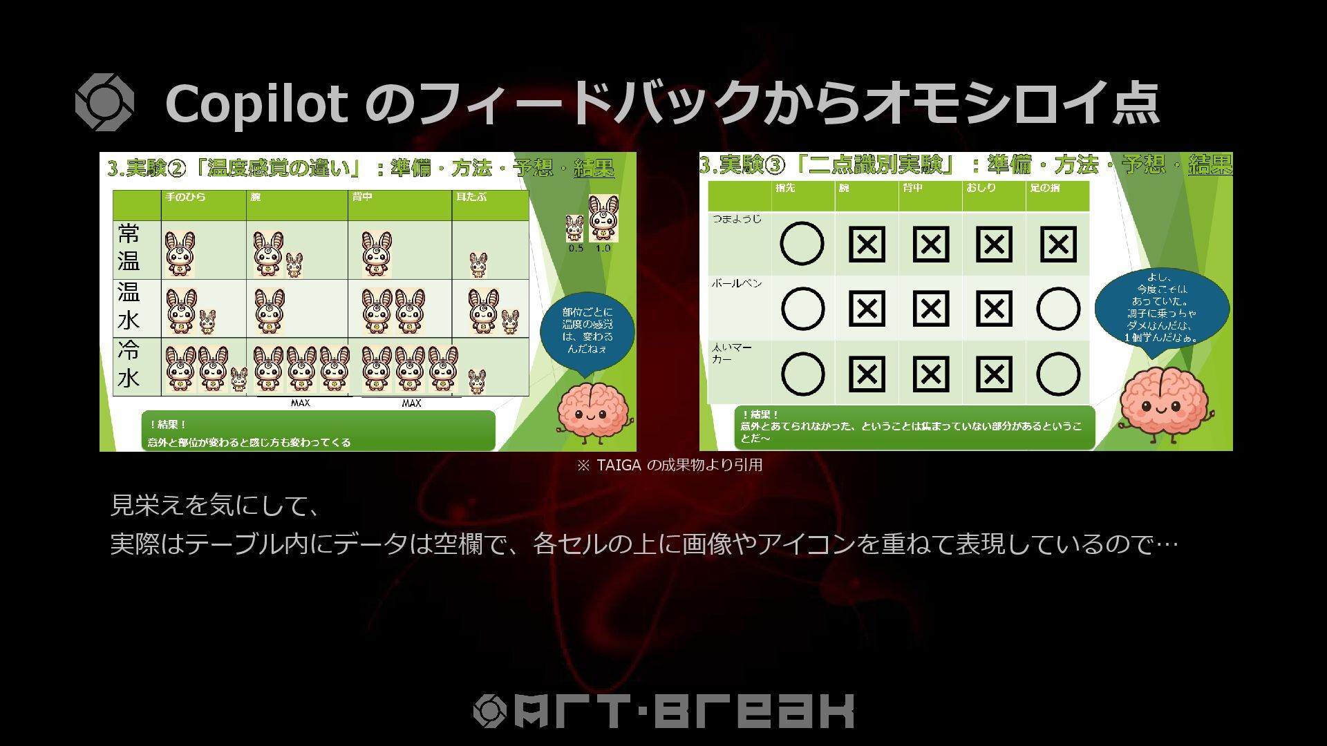 Copilot のフィードバックからオモシロイ点 見栄えを気にして、 実際はテーブル内にデータは空欄で、各セルの上に画像やアイコンを重ねて表現しているので… ※ TAIGA の成果物より引用