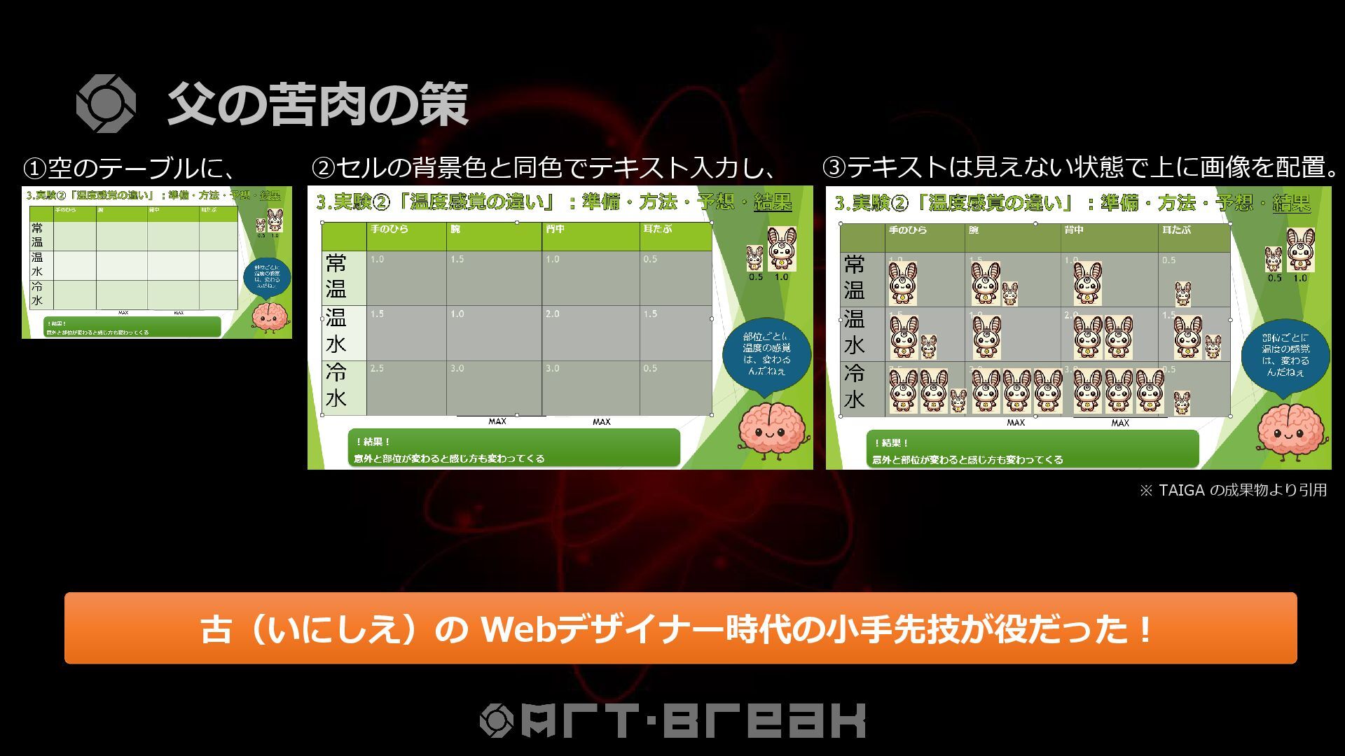 父の苦肉の策 ①空のテーブルに、 ②セルの背景色と同色でテキスト入力し、 ③テキストは見えない状態で上に画像を配置。 古(いにしえ)の Webデザイナー時代の小手先技が役だった! ※ TAIGA の成果物より引用