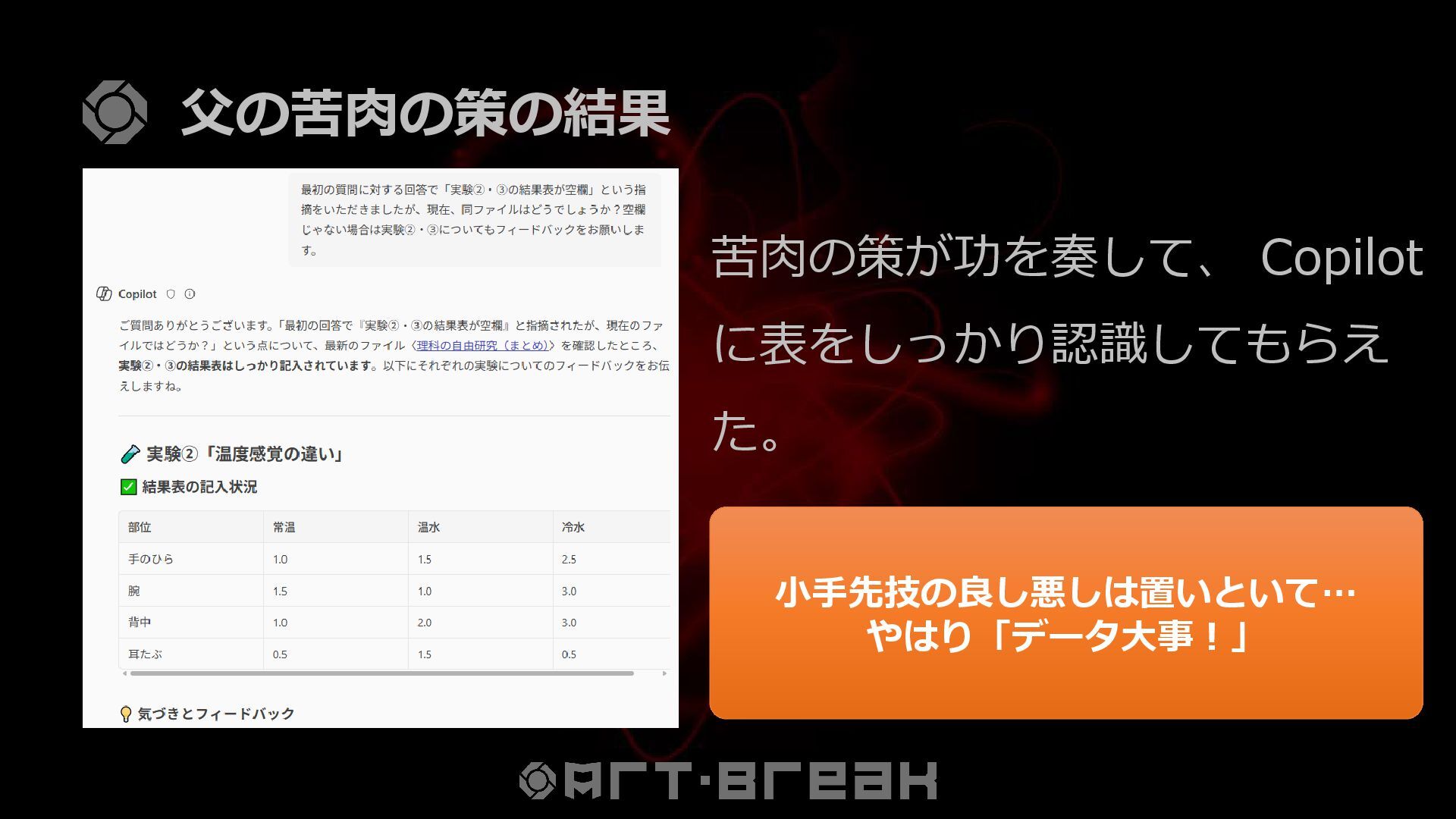 父の苦肉の策の結果 苦肉の策が功を奏して、 Copilot に表をしっかり認識してもらえ た。 小手先技の良し悪しは置いといて… やはり「データ大事!」