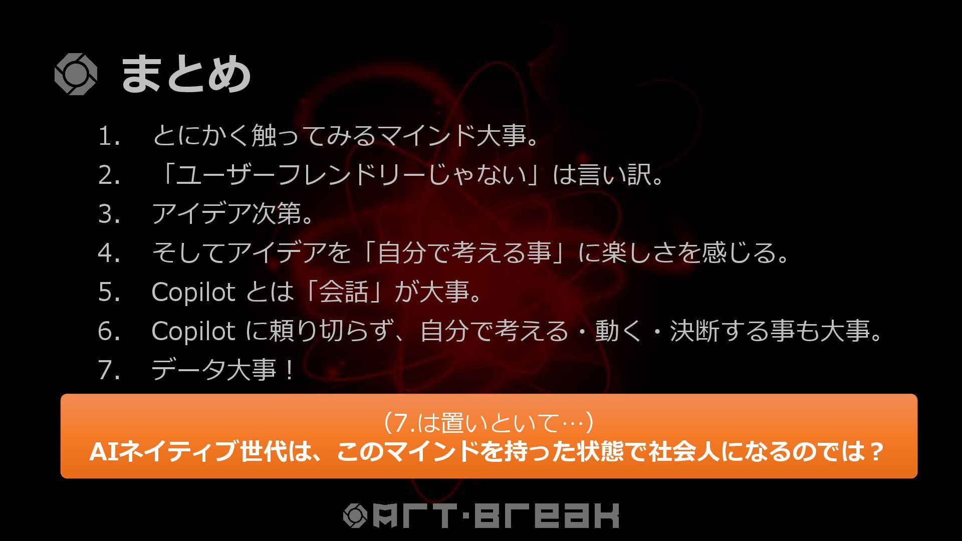 Copilot とは「会話」が大事。 6. Copilot に頼り切らず、自分で考える・動く・決断する事も大事。 7. データ大事! (7.は置いといて…) AIネイティブ世代は、このマインドを持った状態で社会人になるのでは?