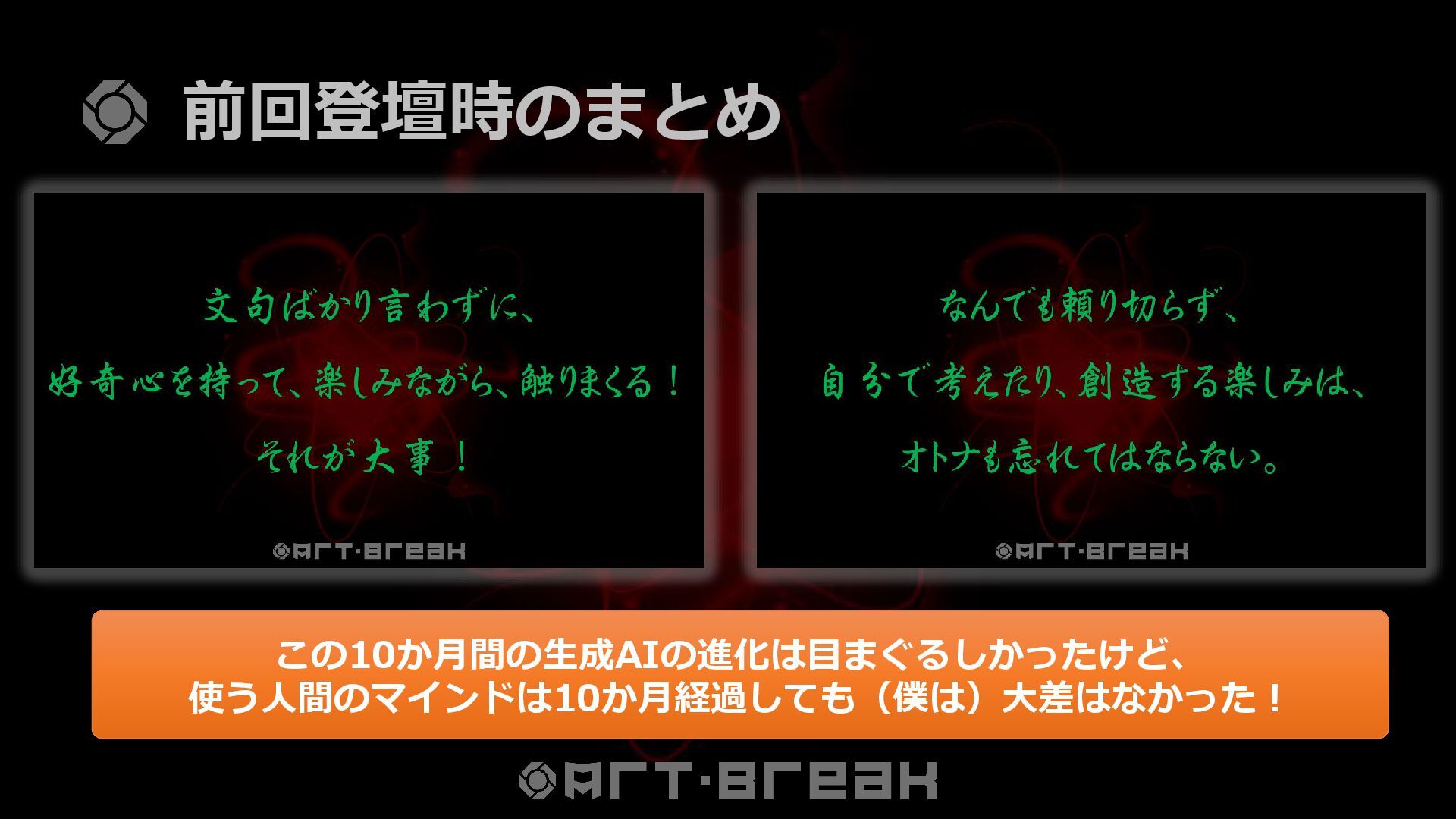 前回登壇時のまとめ この10か月間の生成AIの進化は目まぐるしかったけど、 使う人間のマインドは10か月経過しても(僕は)大差はなかった!