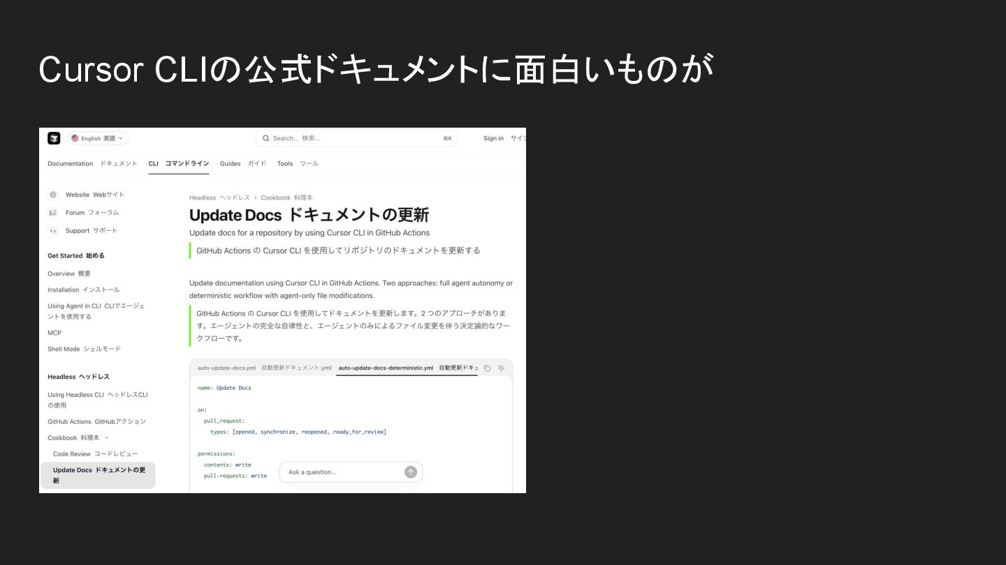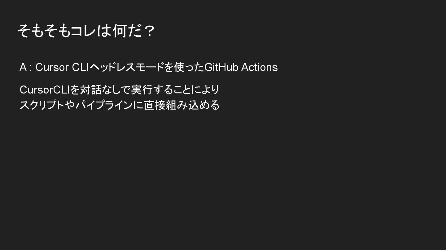 そもそもコレは何だ? A : Cursor CLIヘッドレスモードを使ったGitHub Actions CursorCLIを対話なしで実行することにより スクリプトやパイプラインに直接組み込める