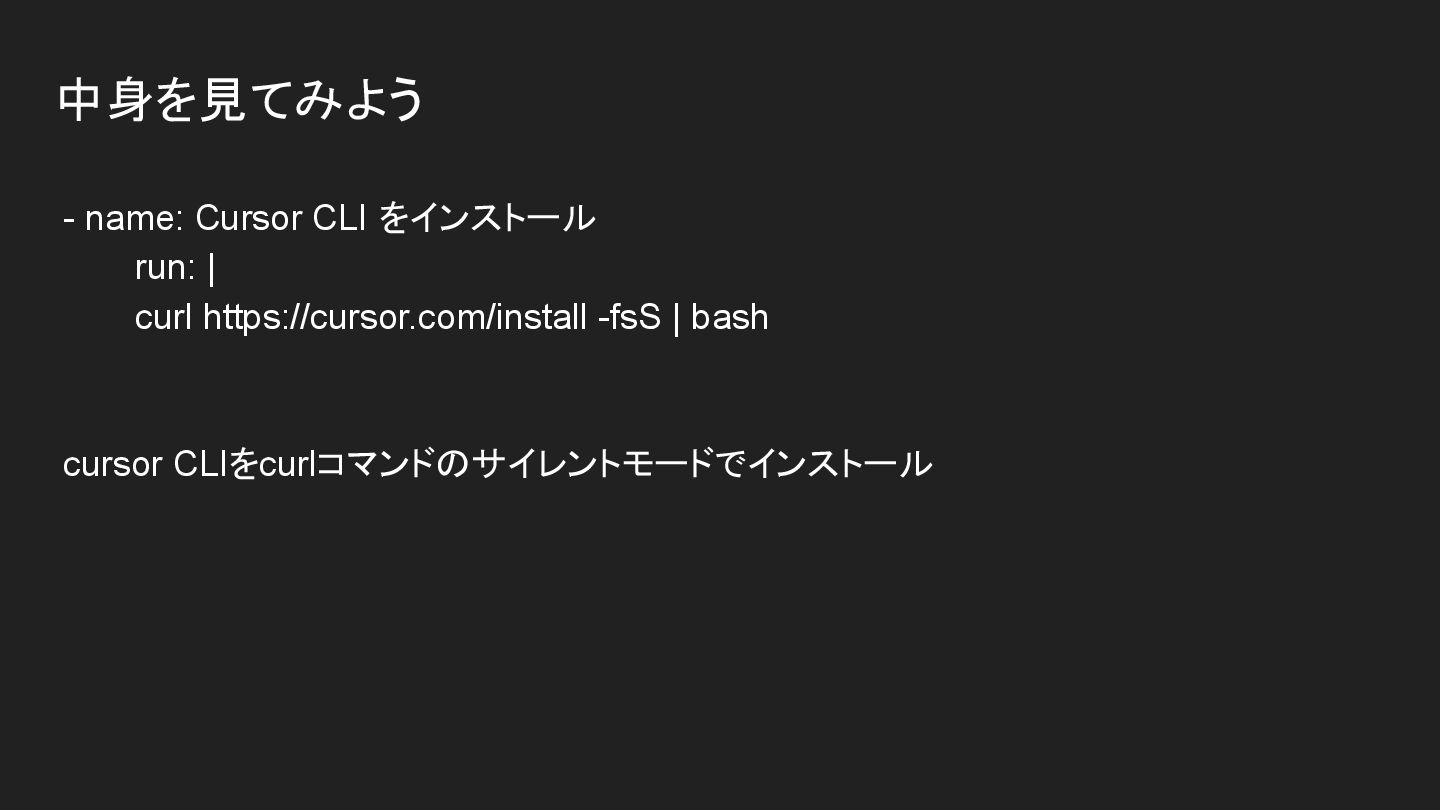 中身を見てみよう - name: Cursor CLI をインストール run: | curl https://cursor.com/install
