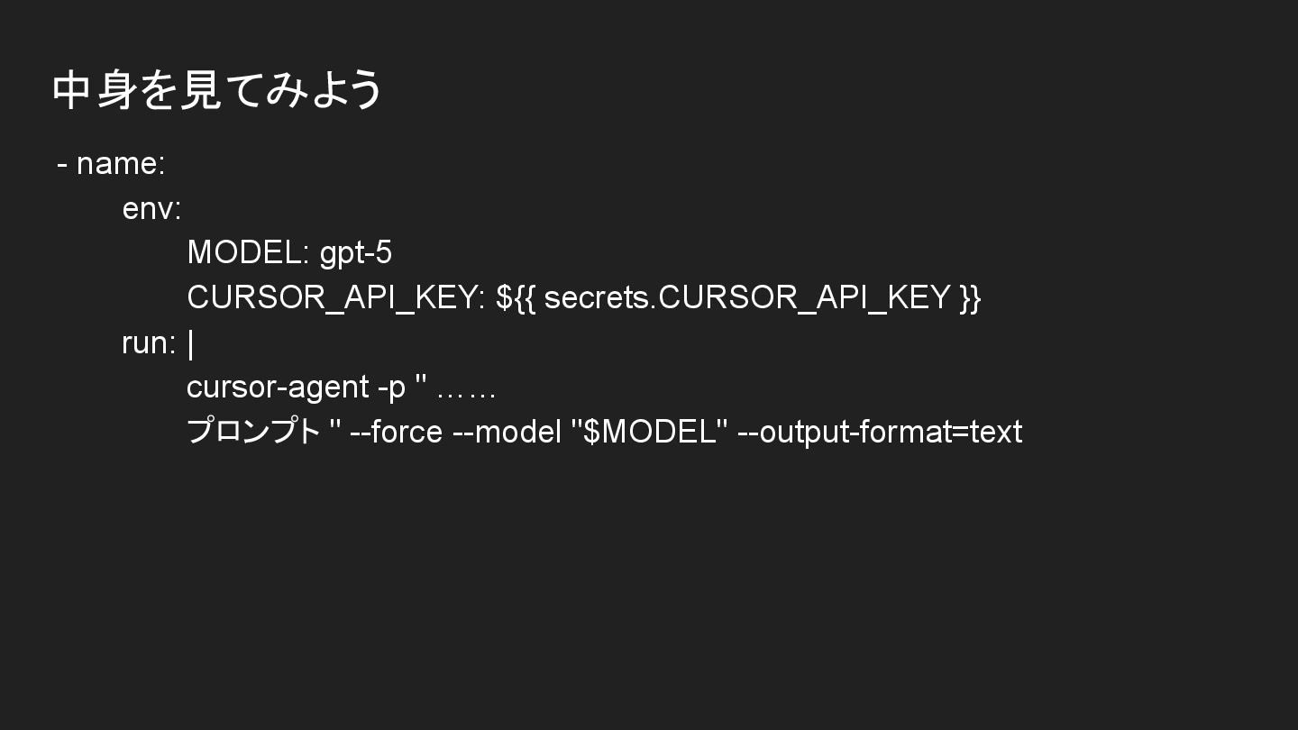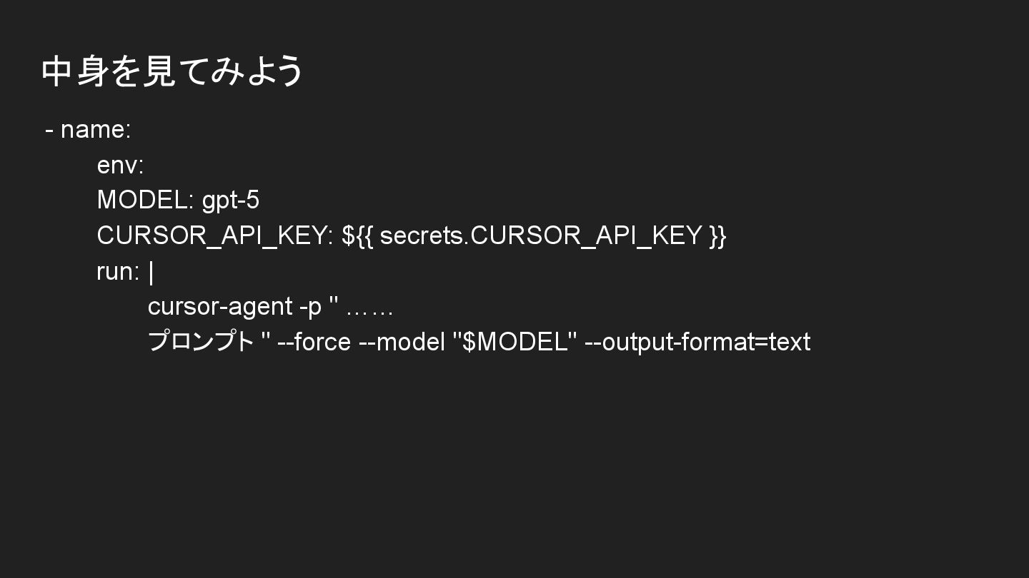中身を見てみよう - name: env: MODEL: gpt-5 CURSOR_API_KEY: ${{ secrets.CURSOR_API_KEY }}