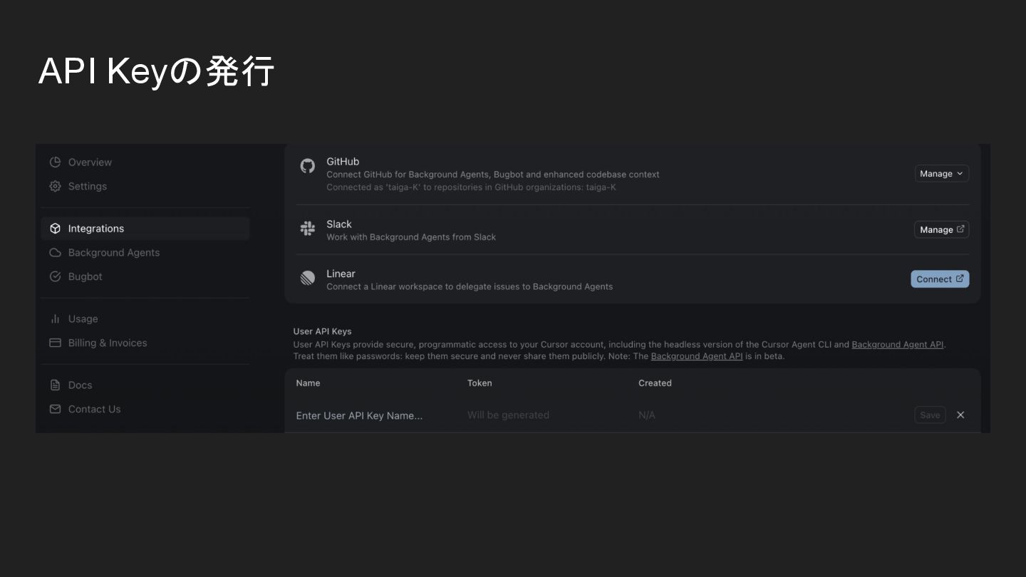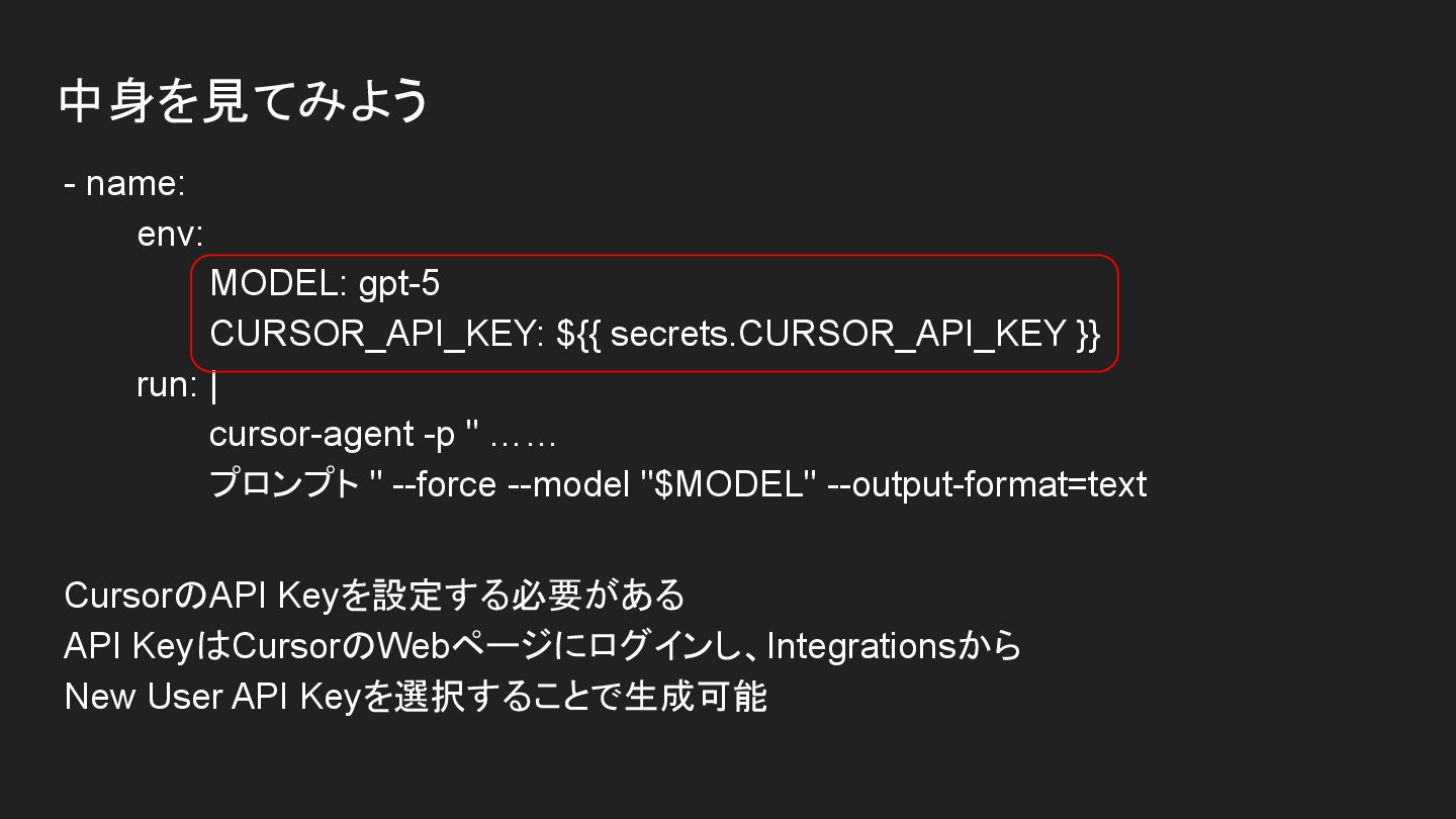 run: | cursor-agent -p " …… プロンプト " --force --model "$MODEL" --output-format=text CursorのAPI Keyを設定する必要がある API KeyはCursorのWebページにログインし、Integrationsから New User API Keyを選択することで生成可能