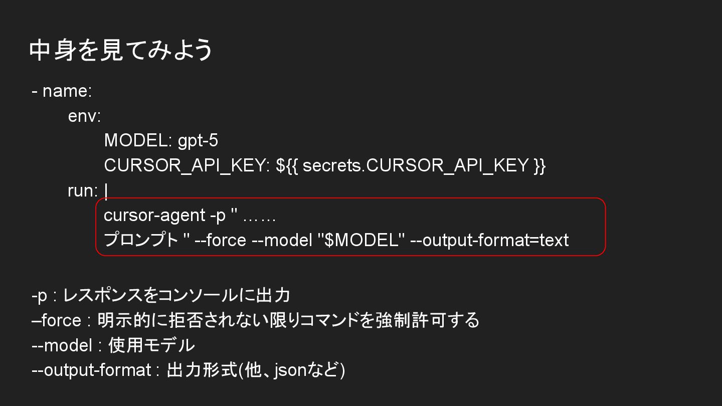 run: | cursor-agent -p " …… プロンプト " --force --model "$MODEL" --output-format=text -p : レスポンスをコンソールに出力 –force : 明示的に拒否されない限りコマンドを強制許可する --model : 使用モデル --output-format : 出力形式(他、jsonなど)