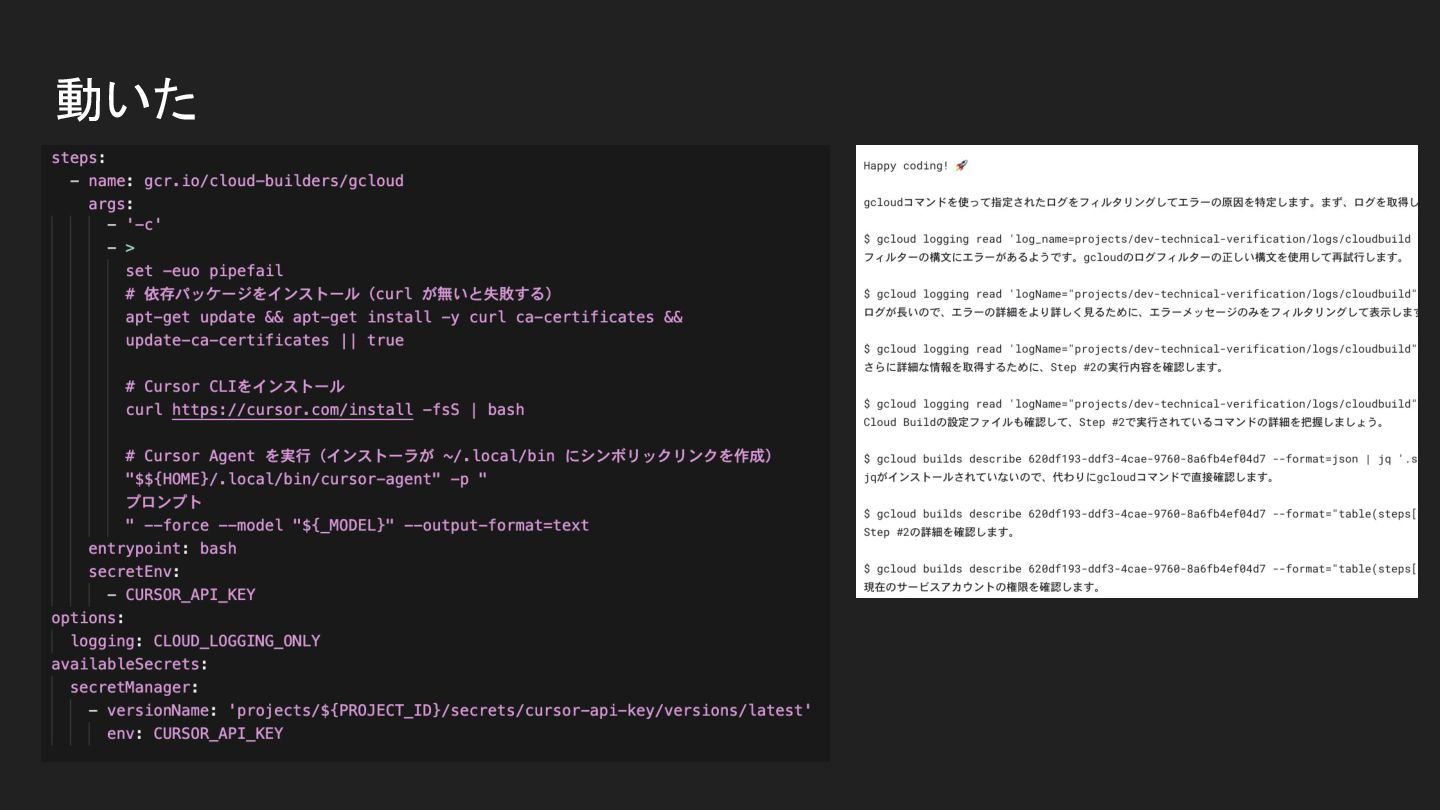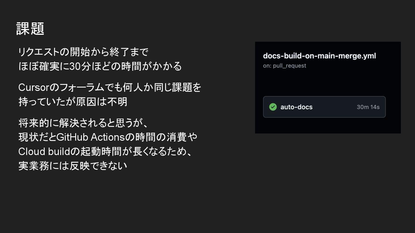 課題 リクエストの開始から終了まで ほぼ確実に30分ほどの時間がかかる Cursorのフォーラムでも何人か同じ課題を 持っていたが原因は不明 将来的に解決されると思うが、 現状だとGitHub Actionsの時間の消費や Cloud buildの起動時間が長くなるため、