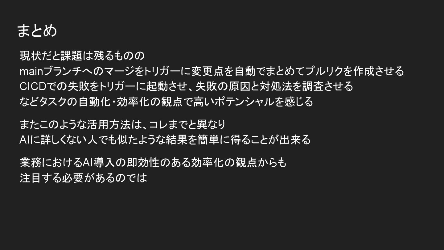 まとめ 現状だと課題は残るものの mainブランチへのマージをトリガーに変更点を自動でまとめてプルリクを作成させる CICDでの失敗をトリガーに起動させ、失敗の原因と対処法を調査させる などタスクの自動化・効率化の観点で高いポテンシャルを感じる またこのような活用方法は、コレまでと異なり AIに詳しくない人でも似たような結果を簡単に得ることが出来る 業務におけるAI導入の即効性のある効率化の観点からも 注目する必要があるのでは