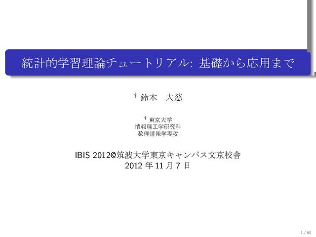 IEEE Transactions on Automatic Control, 19(6):716–723, 1974. P. Alquier and K. Lounici. PAC-Bayesian bounds for sparse regression estimation with exponential weights. Electronic Journal of Statistics, 5:127–145, 2011. R. Baraniuk, M. Davenport, R. DeVore, and M. Wakin. A simple proof of the restricted isometry property for random matrices. Constructive Approximation, 28(3):253–263, 2008. P. Bartlett, O. Bousquet, and S. Mendelson. Local Rademacher complexities. The Annals of Statistics, 33:1487–1537, 2005. P. Bartlett, M. Jordan, and D. McAuliffe. Convexity, classification, and risk bounds. Journal of the American Statistical Association, 101:138–156, 2006. P. L. Bartlett and A. Tewari. Sparseness vs estimating conditional probabilities: Some asymptotic results. Journal of Machine Learning Research, 8:775–790, 2007. C. Bennett and R. Sharpley. Interpolation of Operators. Academic Press, Boston, 1988. P. J. Bickel, Y. Ritov, and A. B. Tsybakov. Simultaneous analysis of Lasso and Dantzig selector. The Annals of Statistics, 37(4):1705–1732, 2009. O. Bousquet. A Bennett concentration inequality and its application to suprema of empirical process. C. R. Acad. Sci. Paris Ser. I Math., 334:495–500, 2002. 60 / 60