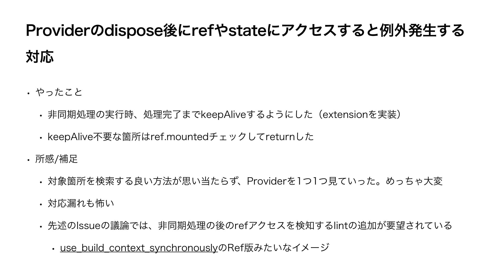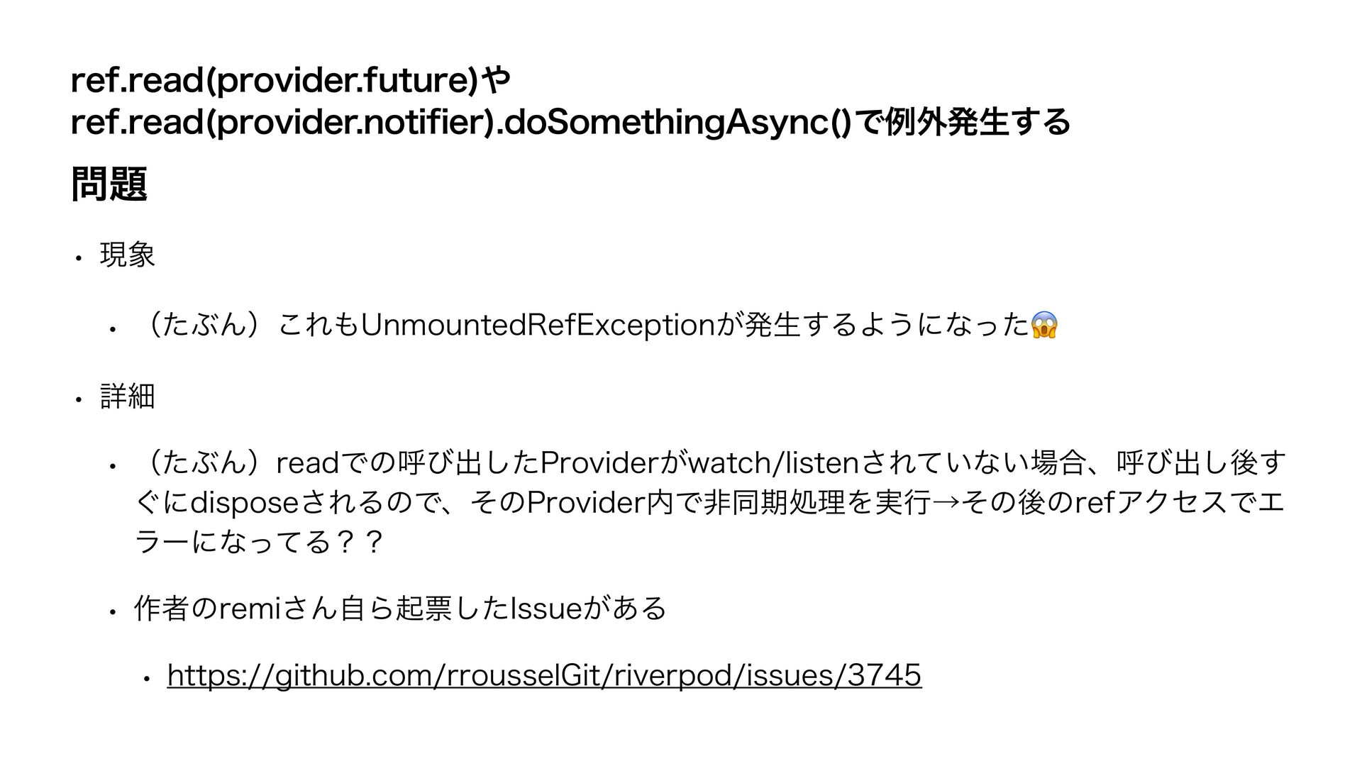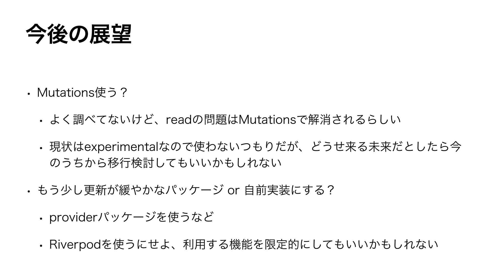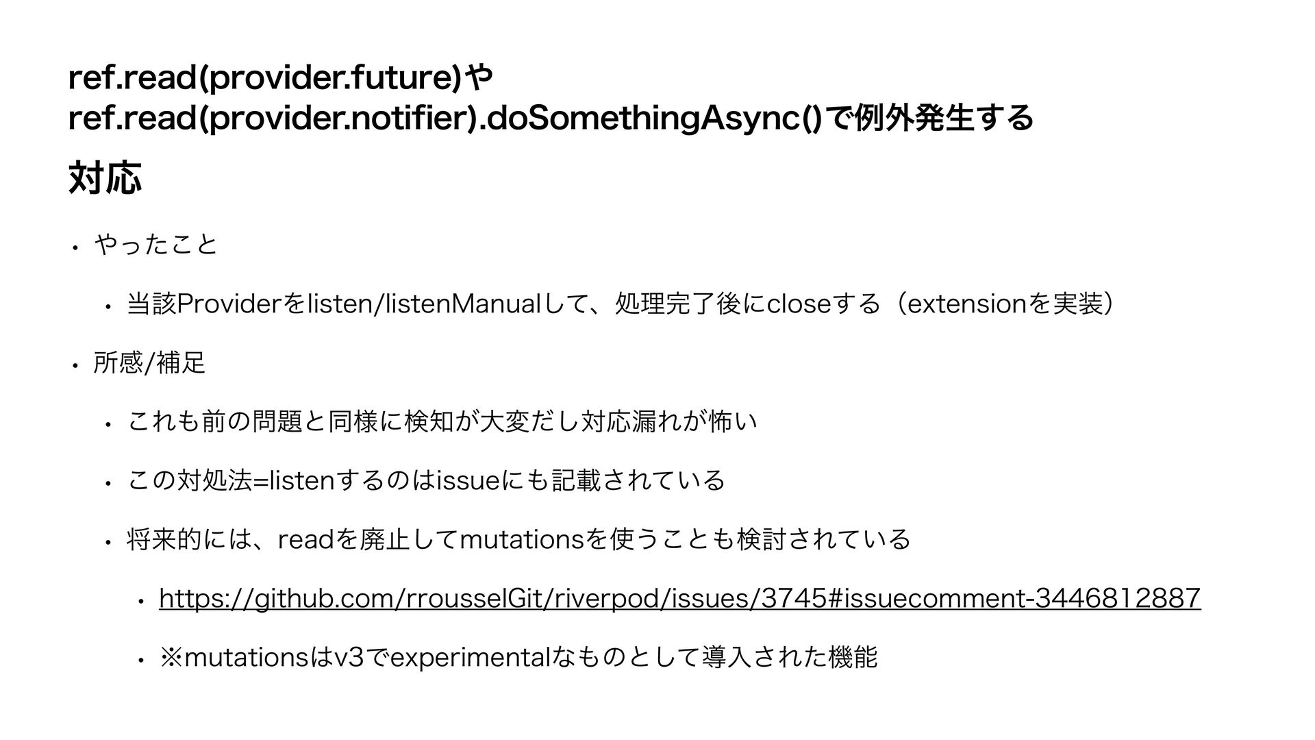 w ֘1SPWJEFSΛMJTUFOMJTUFO.BOVBMͯ͠ɺॲཧྃޙʹDMPTF͢ΔʢFYUFOTJPOΛ࣮ʣ w ॴײิ w ͜Εલͷͱಉ༷ʹݕ͕େมͩ͠ରԠ࿙Ε͕ා͍ w ͜ͷରॲ๏MJTUFO͢ΔͷJTTVFʹهࡌ͞Ε͍ͯΔ w কདྷతʹɺSFBEΛഇࢭͯ͠NVUBUJPOTΛ͏͜ͱݕ౼͞Ε͍ͯΔ w IUUQTHJUIVCDPNSSPVTTFM(JUSJWFSQPEJTTVFTJTTVFDPNNFOU w ˞NVUBUJPOTWͰFYQFSJNFOUBMͳͷͱͯ͠ಋೖ͞Εͨػೳ